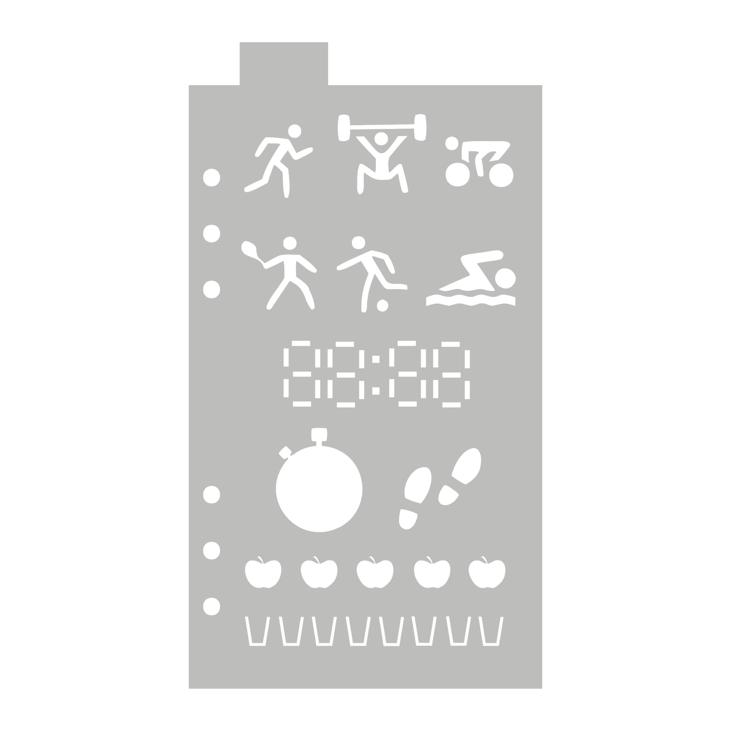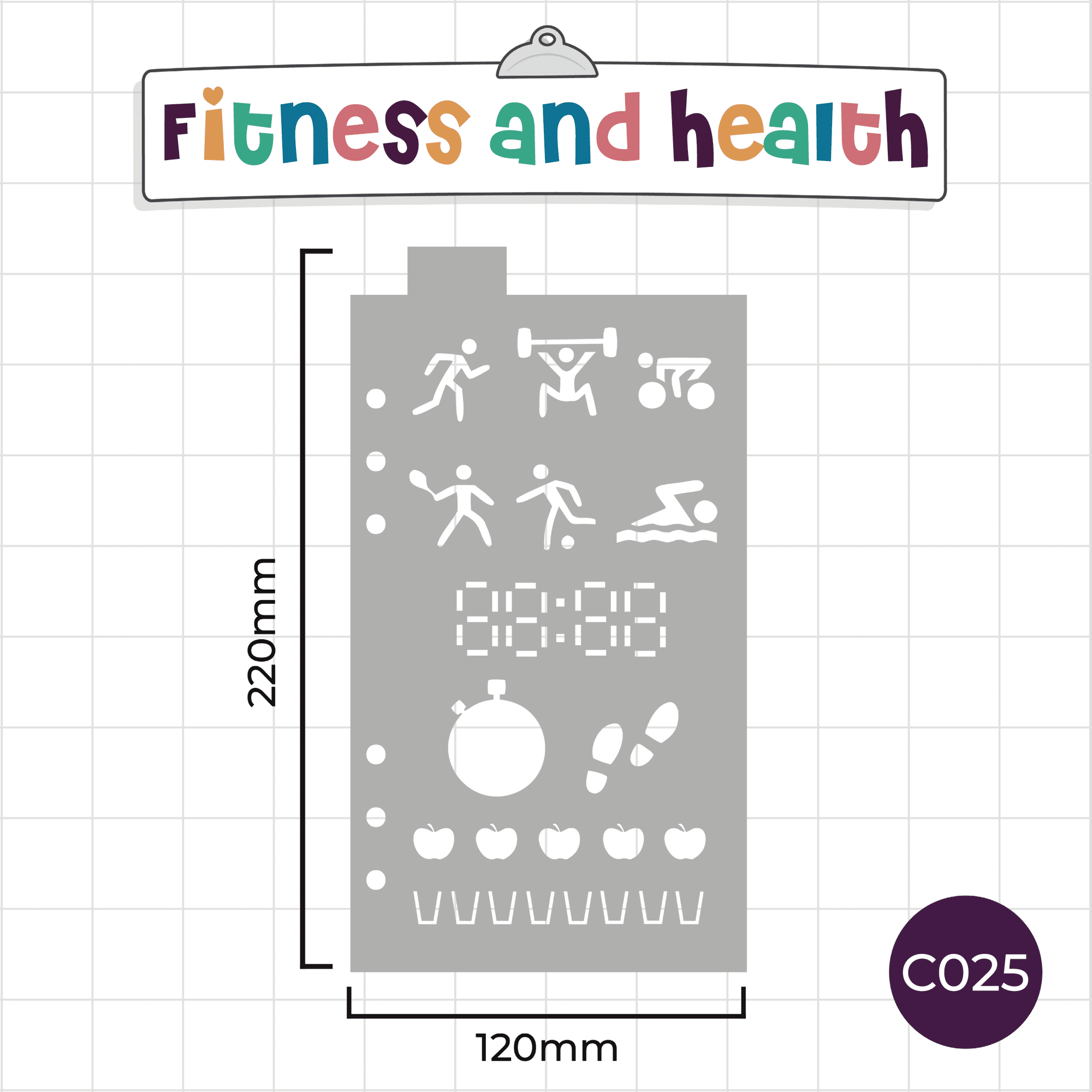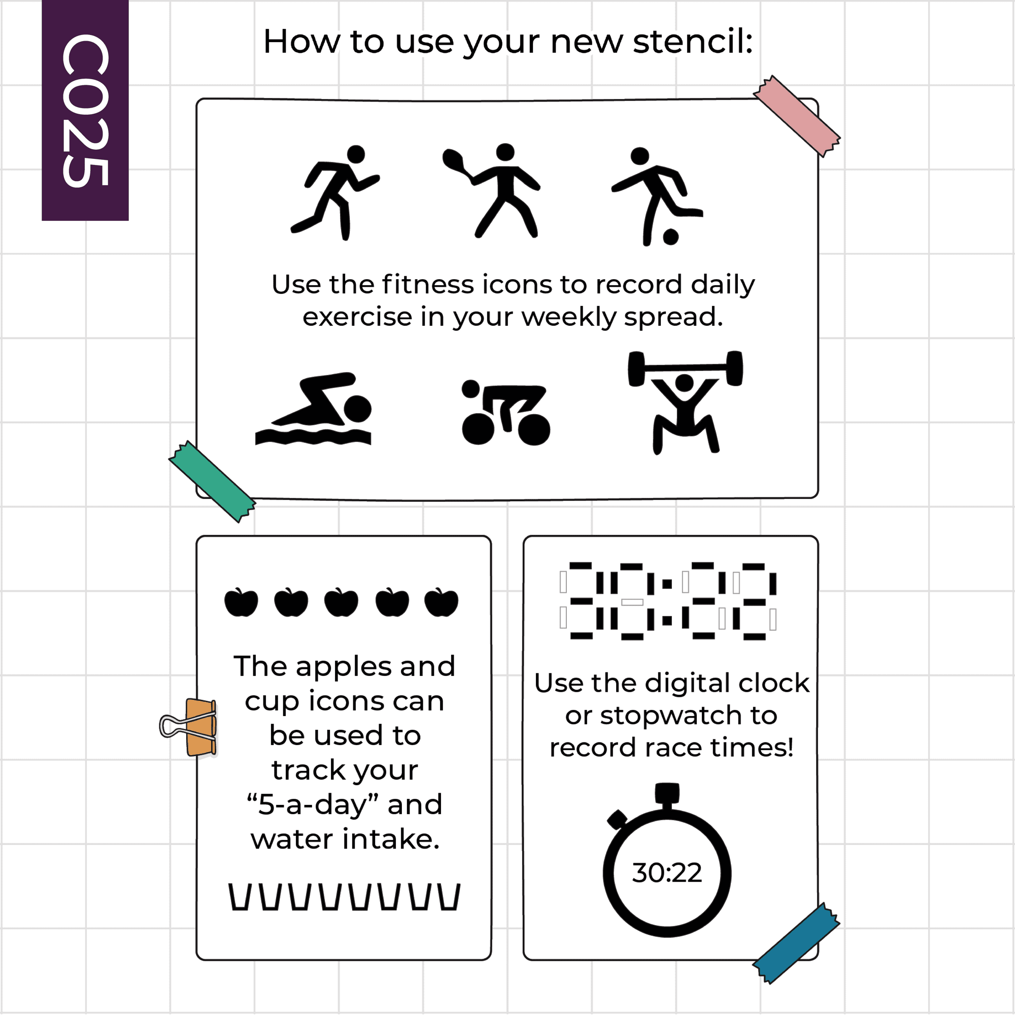 This journal stencil contains everything you need to create fun and useful fitness themed spreads and trackers in your bullet journal – Including a digital clock and stopwatch for tracking timings, various exercise icons, plus icons to track your 5-a-day and water intake.