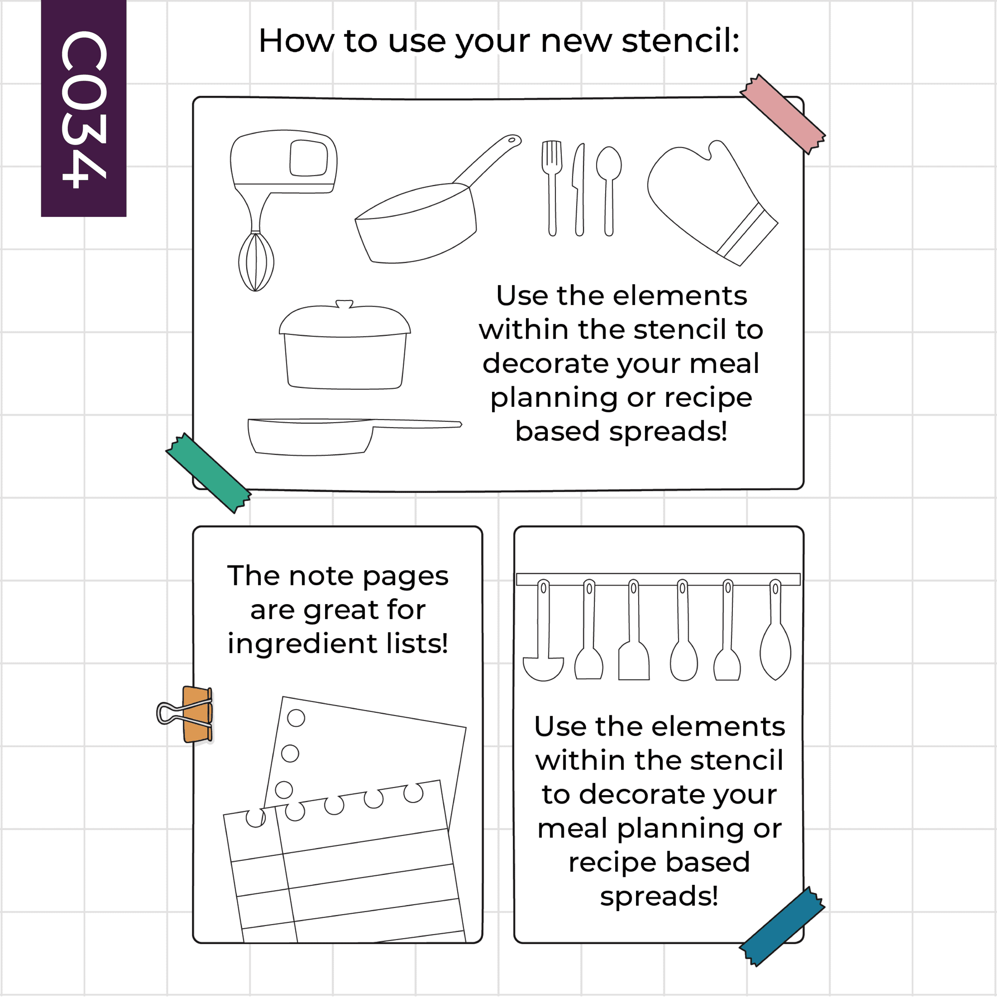 This journal stencil features everything you need to create a meal plan for your day or week, or to simply decorate your bullet journal pages with a fun food theme – Check out the gallery for more inspiration!