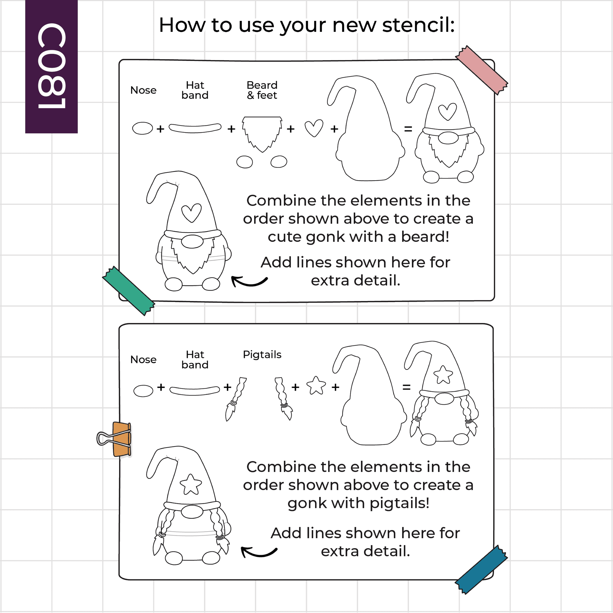 Gonks are for life... Not just for Christmas. This stencil contains elements to help you draw different Gonk characters in your journal - Simply mix and match the beard, hair braids, and hat decorations!