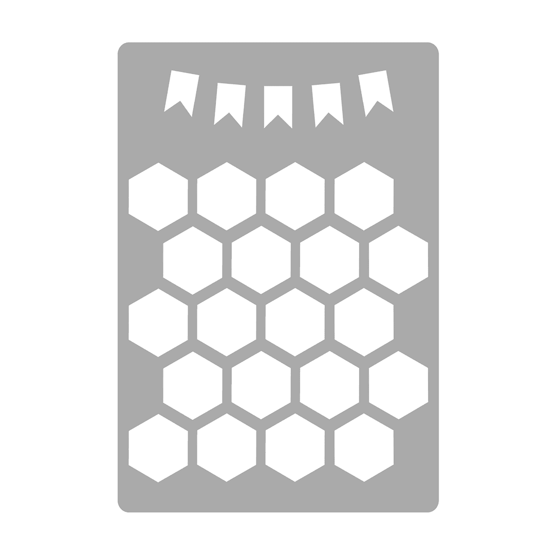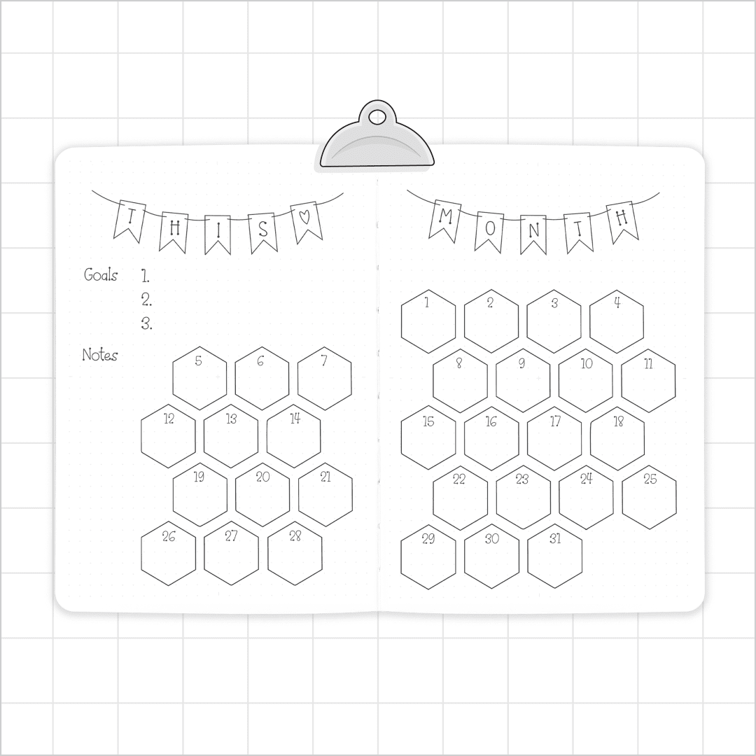 This journal stencil helps you quickly create a fun hexagon-themed monthly spread. It features a banner across the top for a heading, plus a box for each day of the month.
