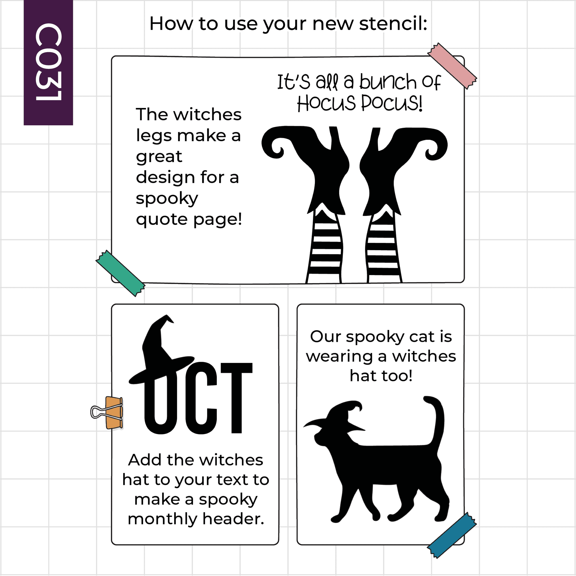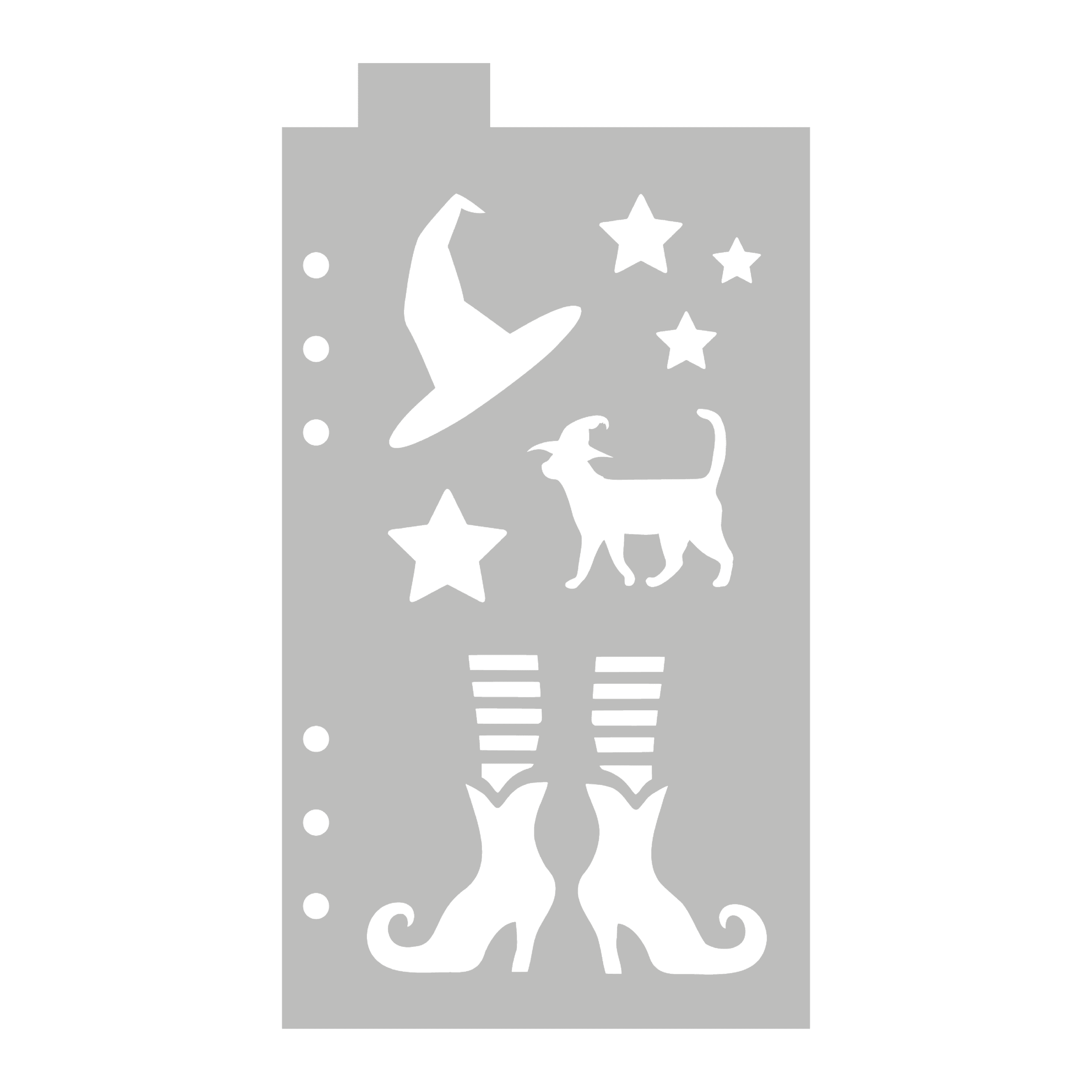 This spooky witch-themed journal stencil features a witch’s boots and hat, a cat, and different sizes stars – Perfect for decorating your Halloween bullet journal spreads, with no artistic talent required!