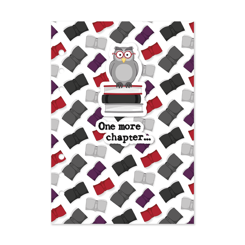 Our Book Noir dashboard features Hooters the Owl standing on stack of books and the text: “One more chapter…” on a background of open books. Perfect for book lovers!