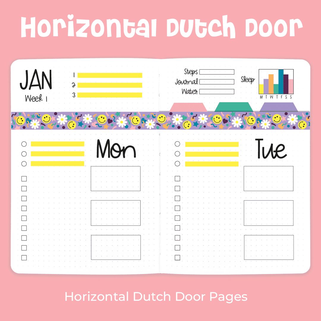 Create a dutch door style weekly spread in your journal, made of 7 daily spreads and a dashboard along the top of the spread to record weekly habits and important information.