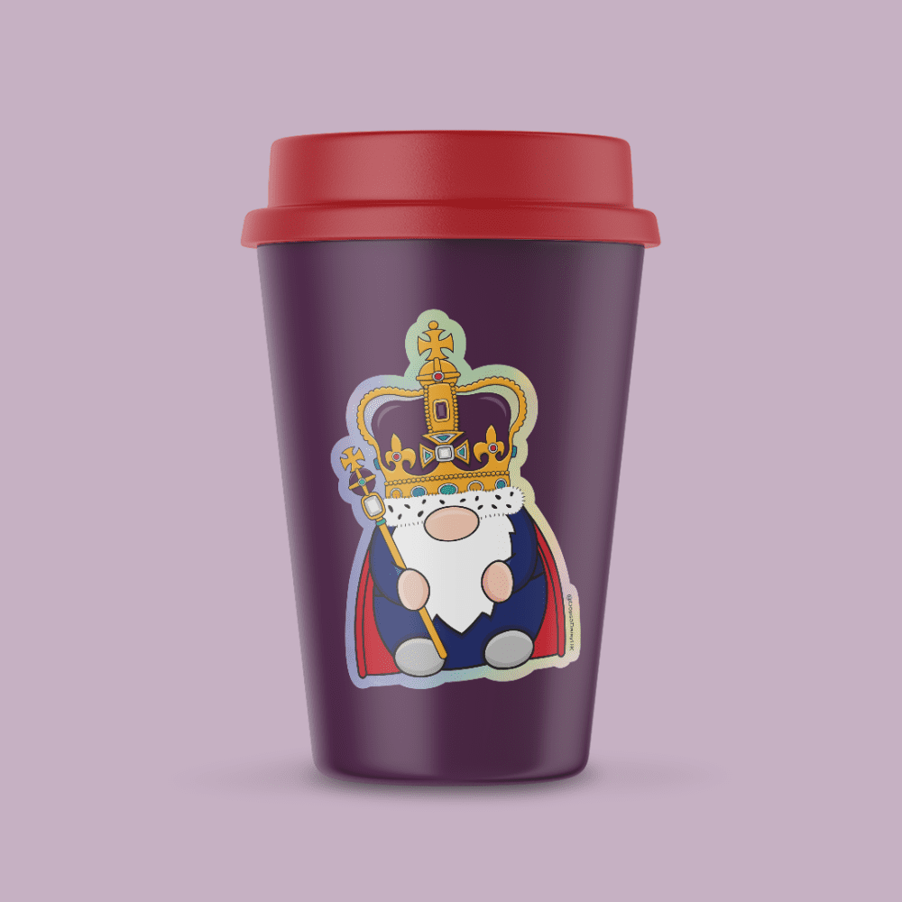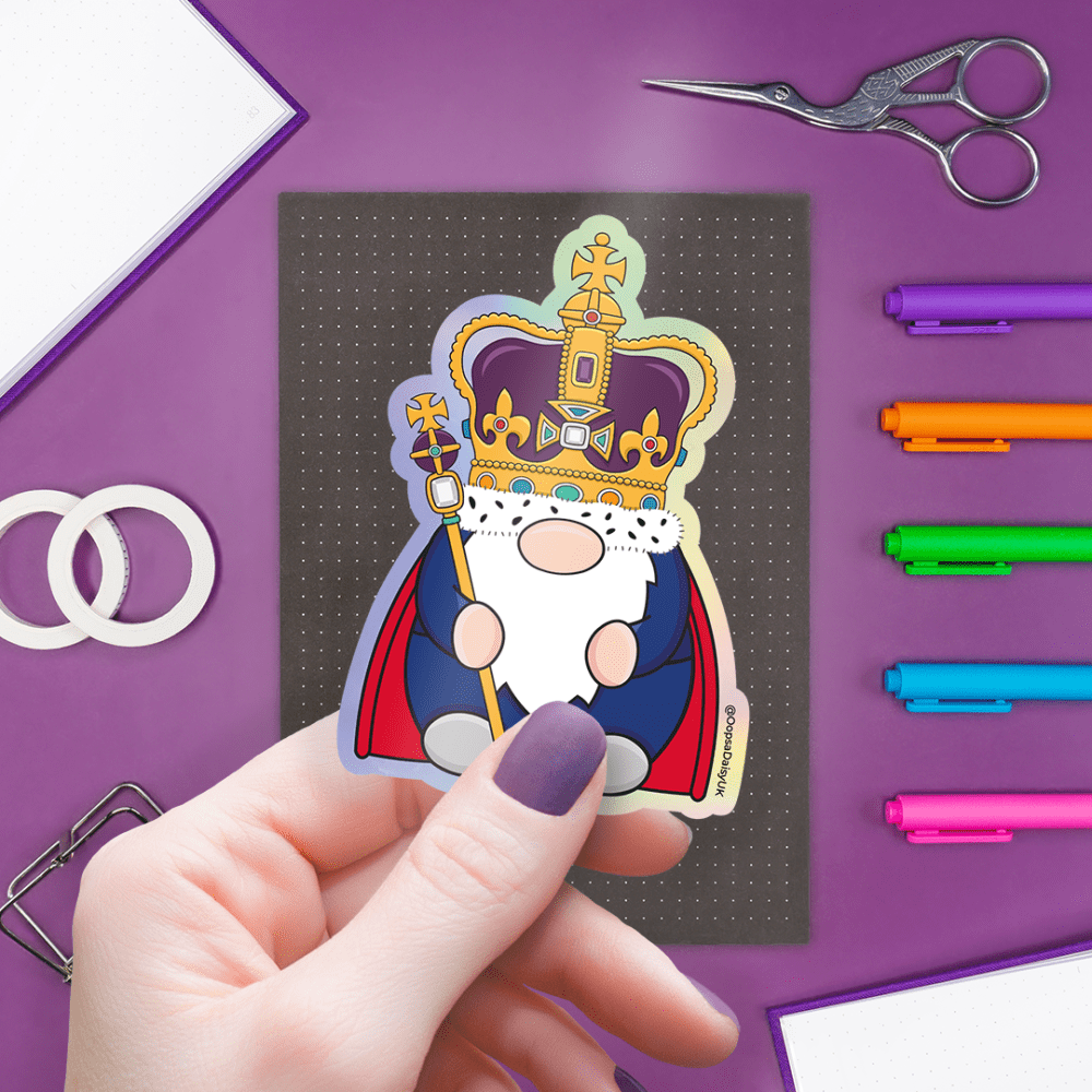 This holographic vinyl sticker features our very regal Gonk ready for his coronation, adorned with crown and sceptre!