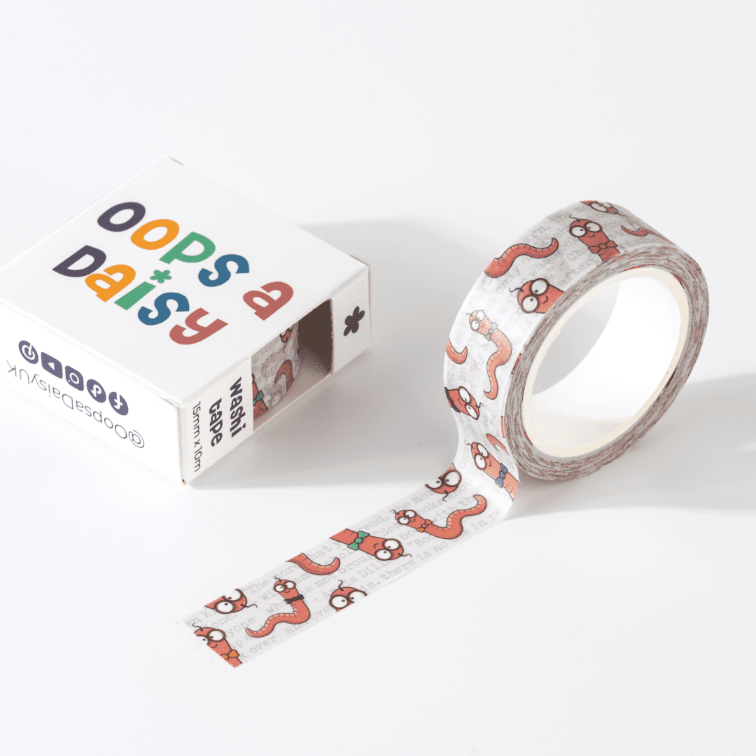 Celebrate your love of books with this Bookworm Washi Tape. Featuring sweet illustrated bookworms with big expressive eyes set against a subtle text-style background, this design is perfect for readers, journal lovers, and planner enthusiasts alike.