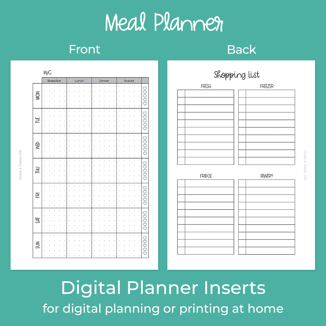 Our meal planner inserts will help you plan all your meals for the week, along with hearts to track your five-a-day or energy levels. There is also loads of space on the reverse to write shopping lists with 4 categories: Fresh, Freezer, Fridge and Pantry. Available with a Monday or Sunday start.