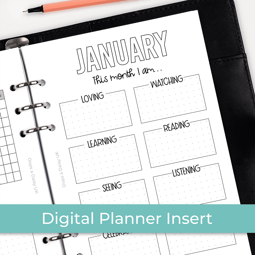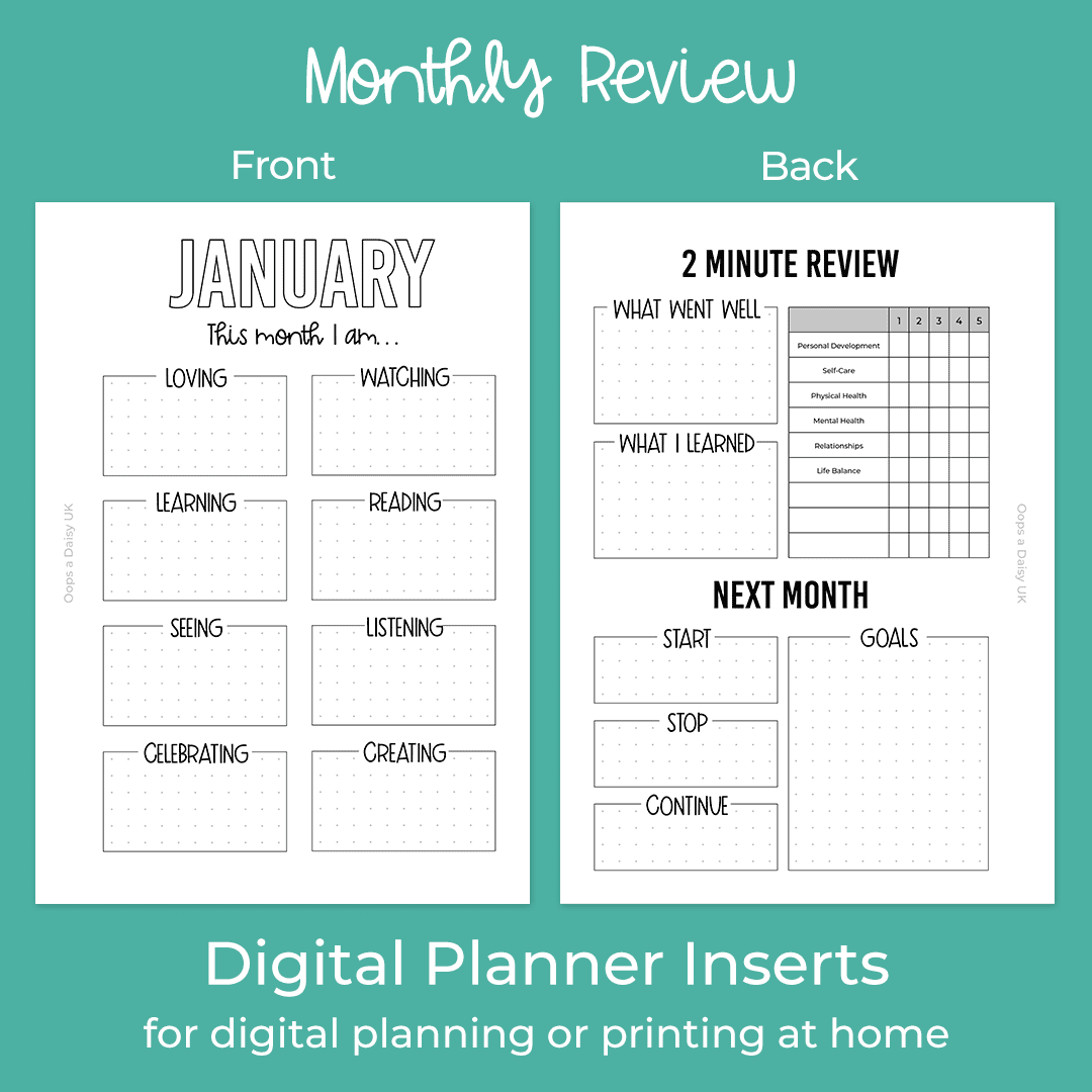 Our month review planner inserts are perfect for adding monthly review pages to your planner using one of our Hybrid Planner Binders! The front side features spaces for you to log the things you have done, seen, watched, listened to, etc. The reverse features a ‘2 Minute Review’, where you can record all the details of your month and score them from 1-5, and a ‘Next Month’ area for you to set some goals.