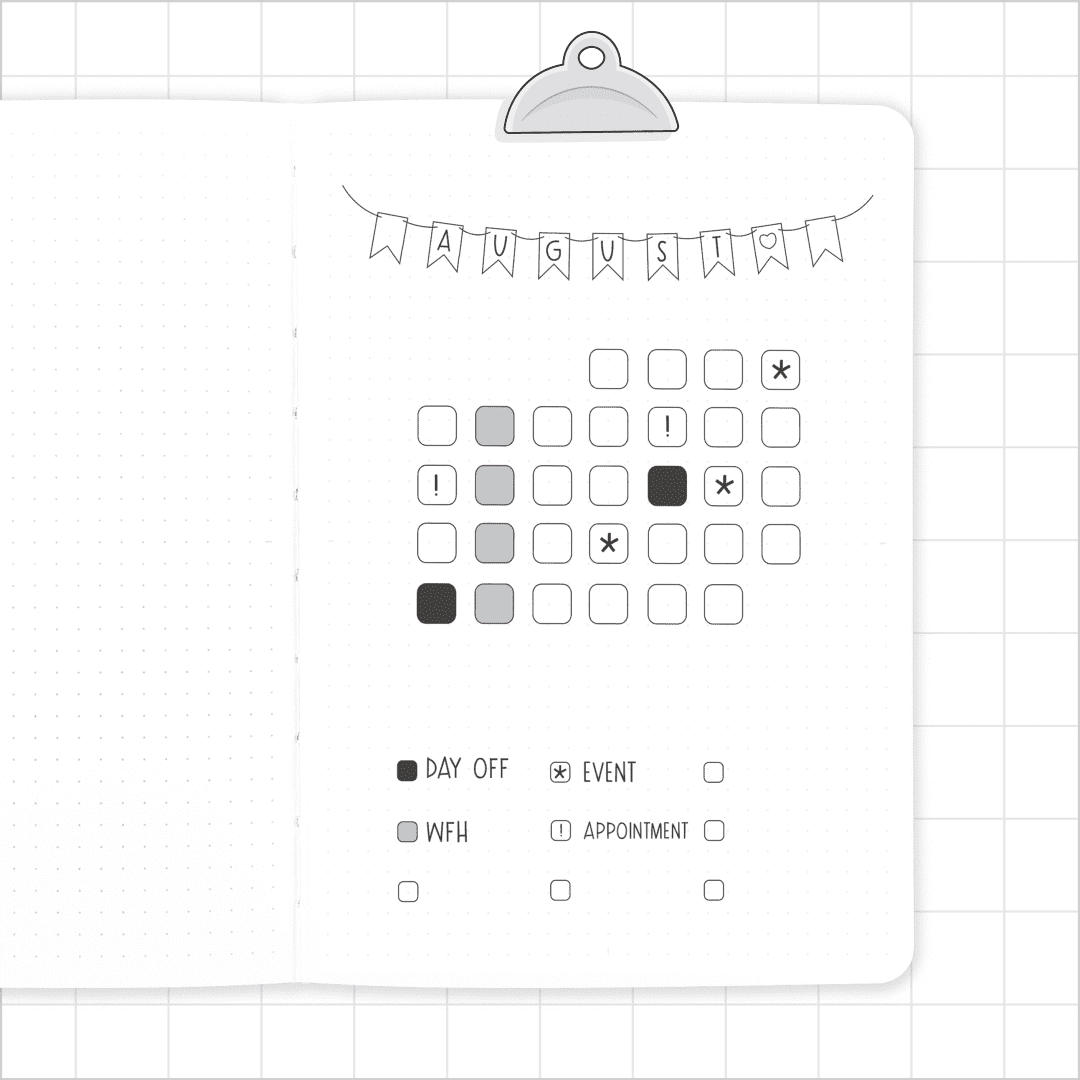 Create a monthly calendar on one page, and use the key at the bottom of the page to add colour codes for your activities.