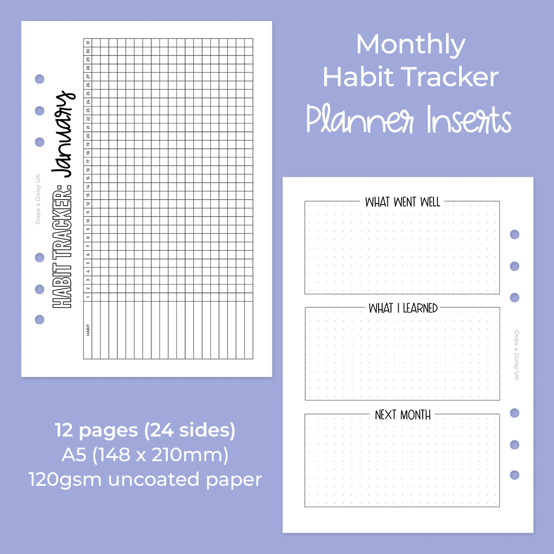 Our monthly habit tracker inserts are great for tracking multiple habits throughout the months. Simply fill in each square using colours, numbers, or symbols, to track your various habits. The reverse features space to review your month, with ‘what went well’, ‘what I learned’ and ‘next month’.