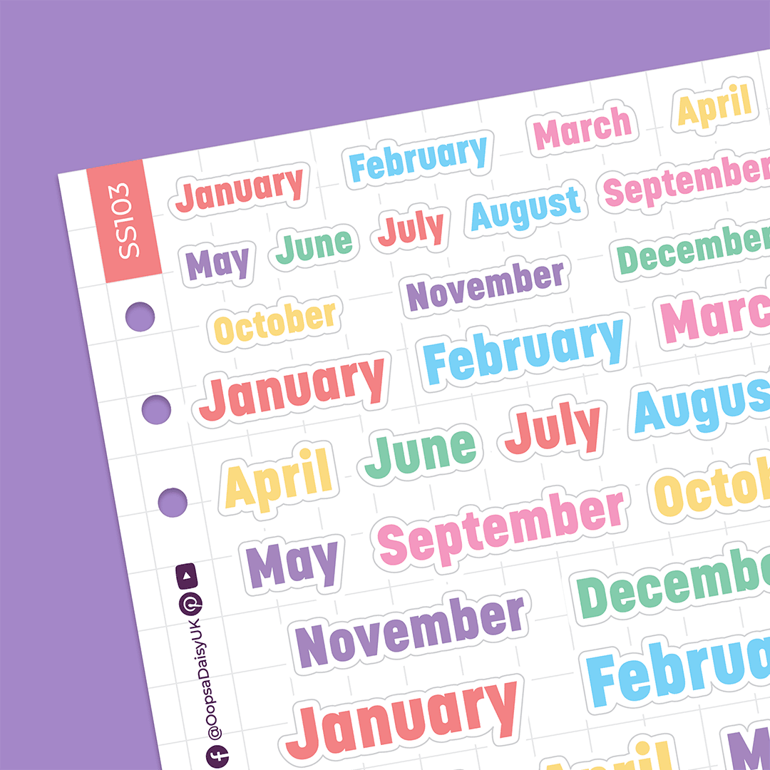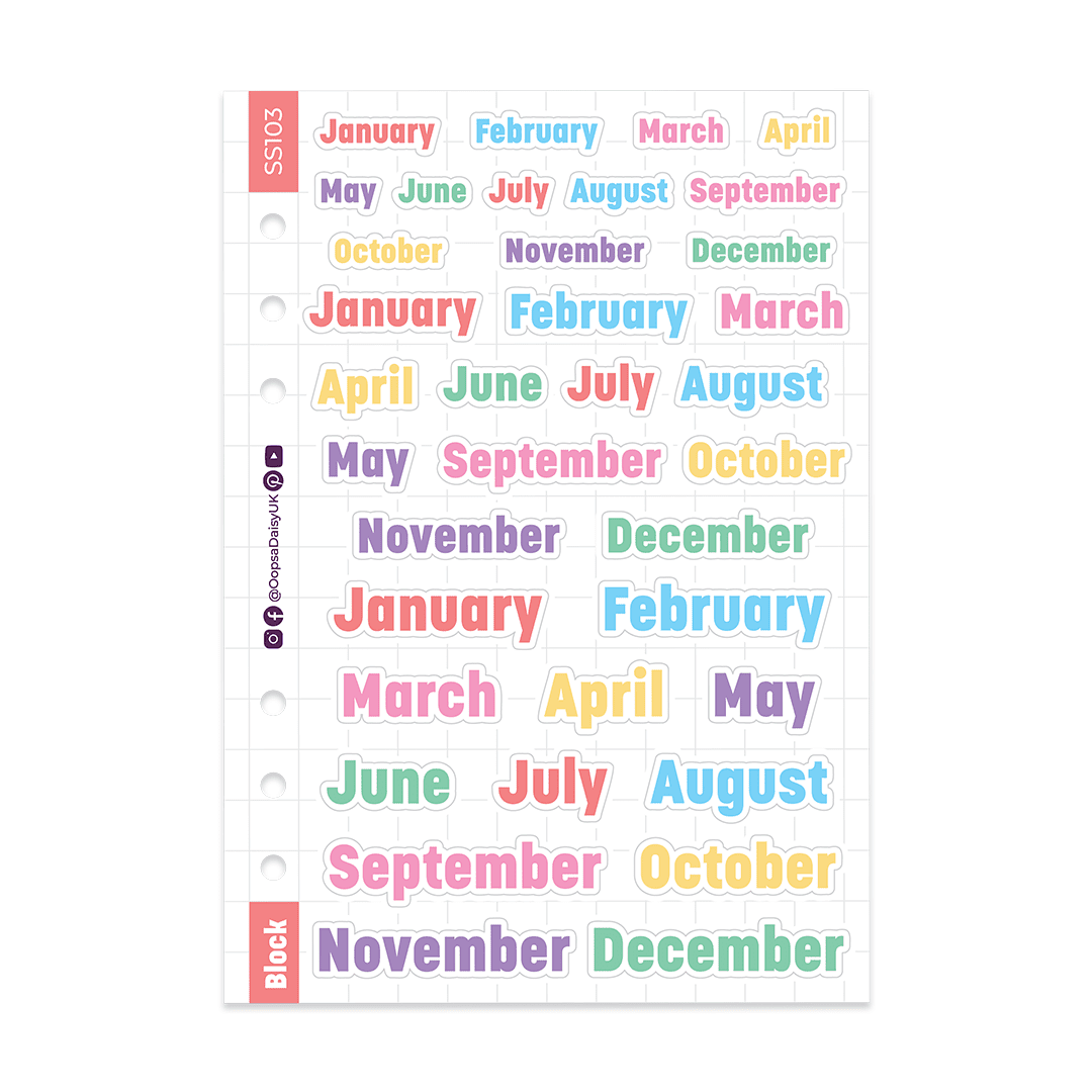 Featuring our ‘Block’ font, these bright rainbow lettering stickers are perfect for adding the month to your daily, weekly or monthly layouts.