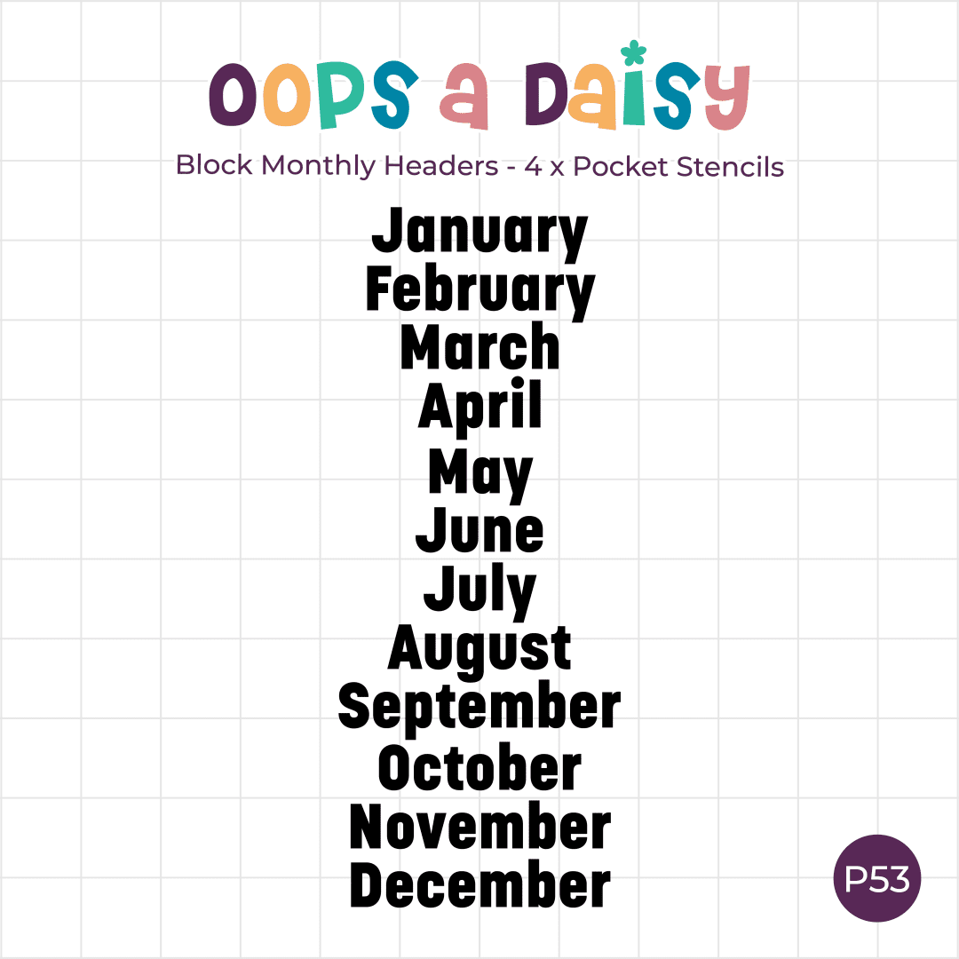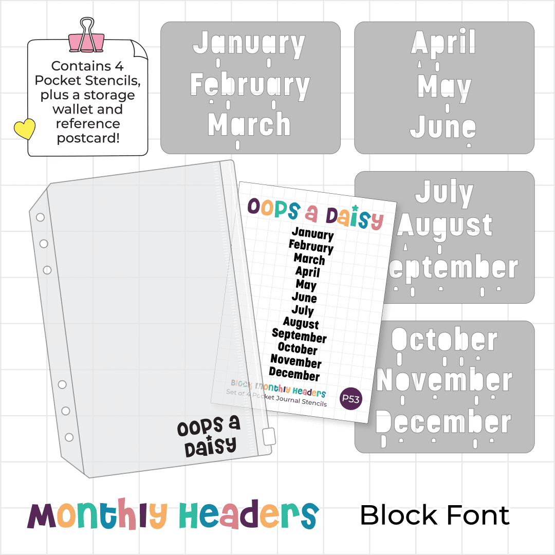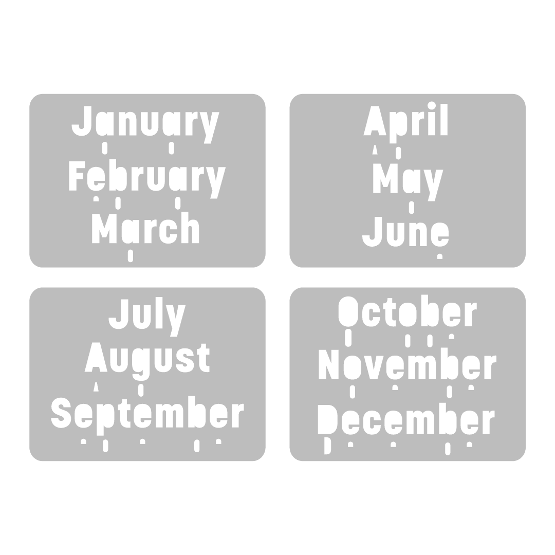 A set of 4 pocket sized stencils featuring all the months of the year in our classic ‘Block’ font. Helps you to quickly and neatly add fun headings to your journal spreads.