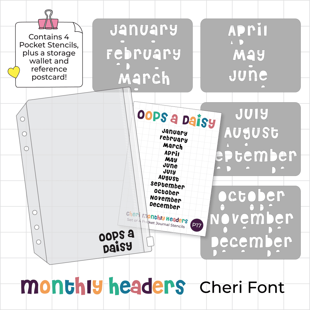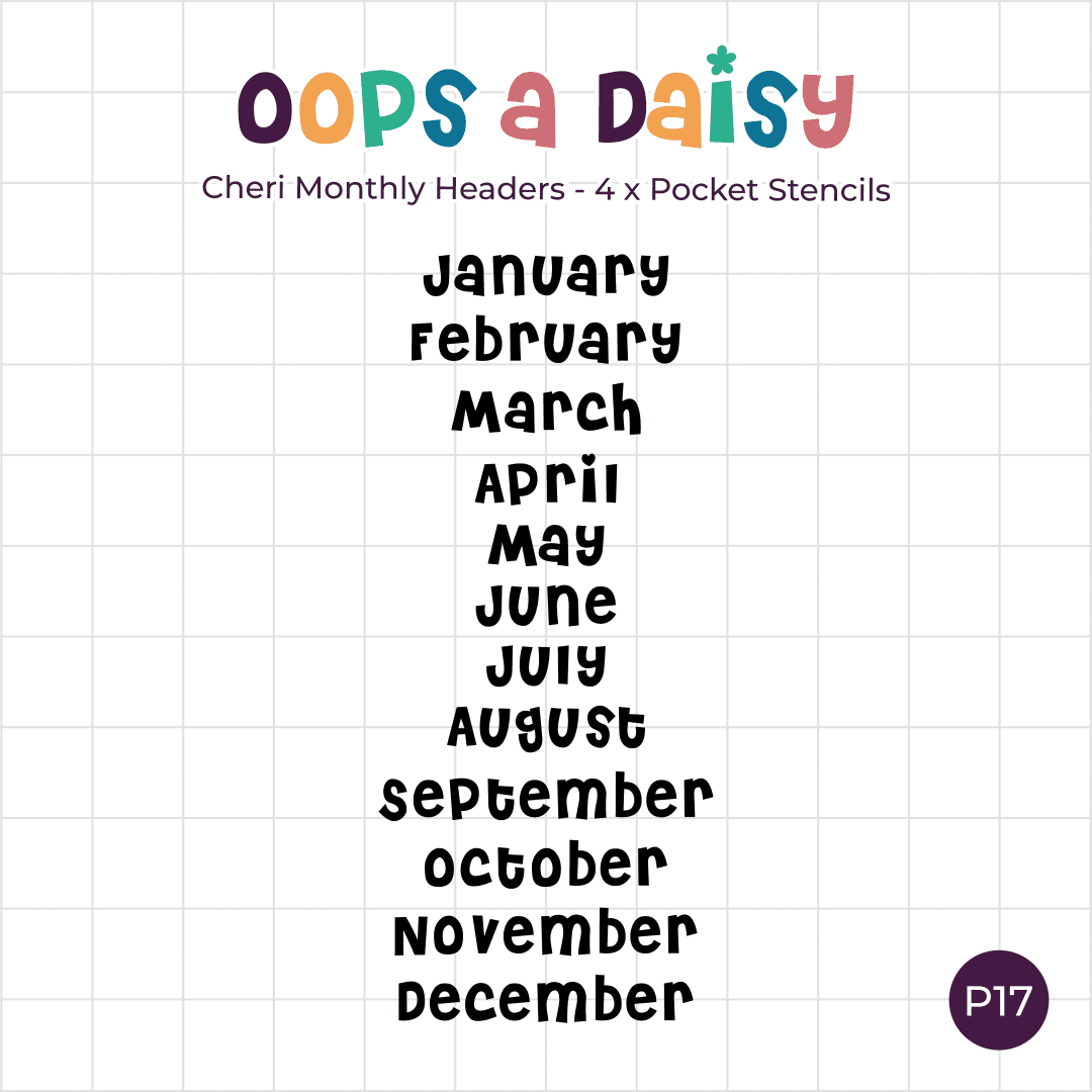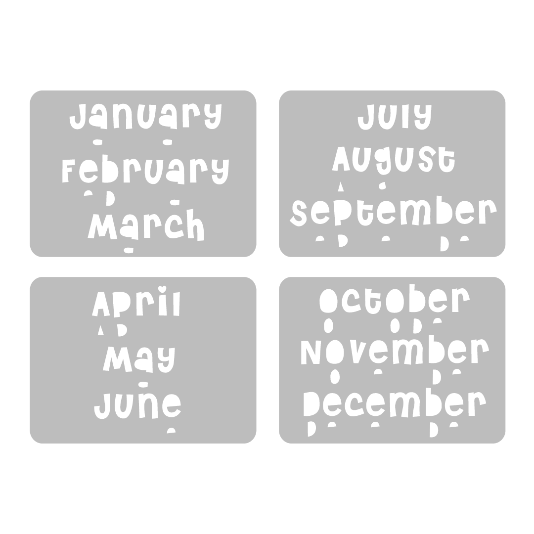 A set of 4 pocket sized stencils featuring all the months of the year in our signature font ‘Cheri’.