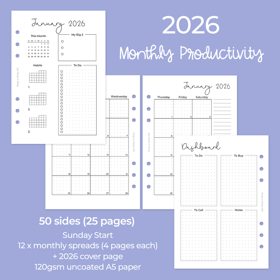 About the 2026 Monthly Productivity (Sunday Start) – A5 Planner Inserts