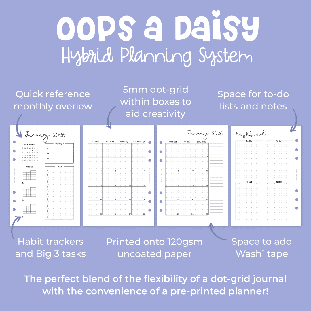 Using a combination of dot-grid pages, along with the convenience of pre-printed designs, results in the ultimate customisable system!
