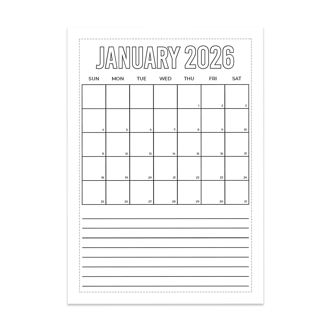 Beneath the calendar is a generous lined section, perfect for notes, priorities, reminders, or monthly highlights. The simple black-and-white design keeps things flexible and uncluttered, making this single-page layout a great foundation for both functional planning and creative spreads.