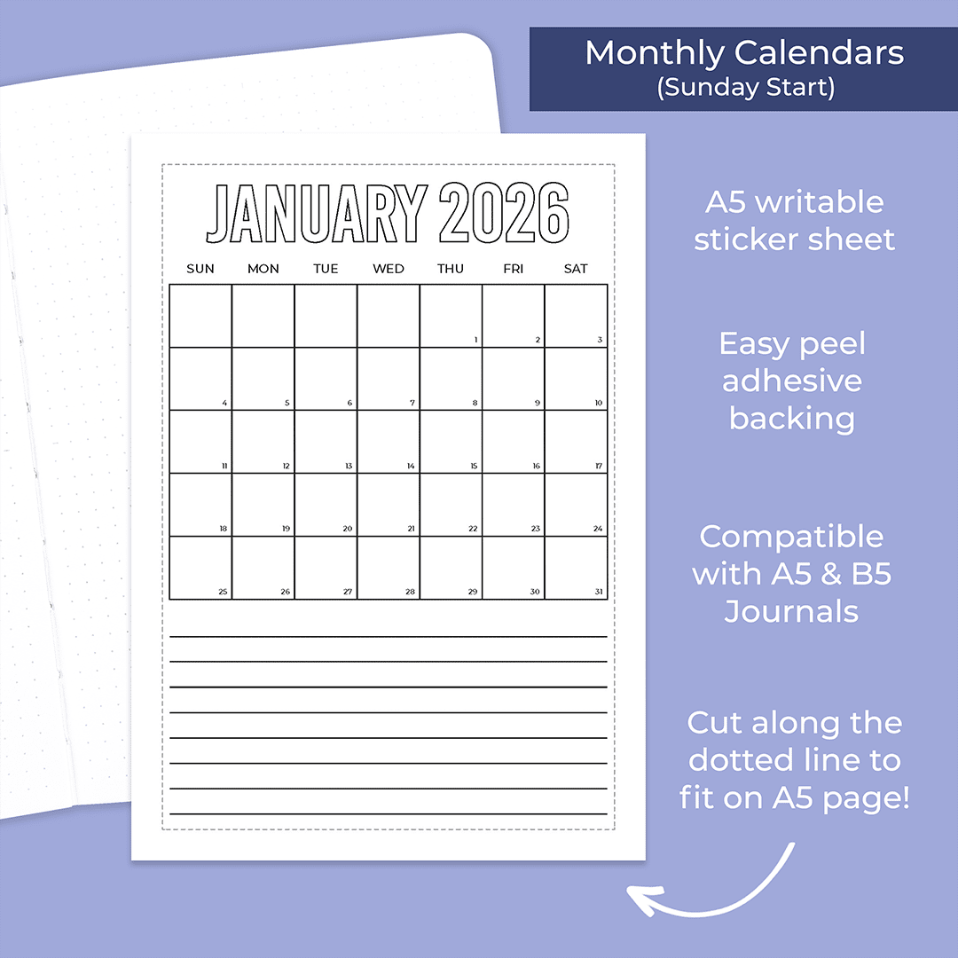This Sunday start Monthly Calendar full-page journal sticker gives you a clean, customisable monthly overview that slips neatly into any planner or journal. The simple grid calendar lets you set up your month exactly the way you like, whether you prefer to highlight key events, mark appointments, track habits, or decorate as you go. With the weekdays already labelled from Sunday to Saturday, it’s quick to fill in and easy to tailor for any month of the year.