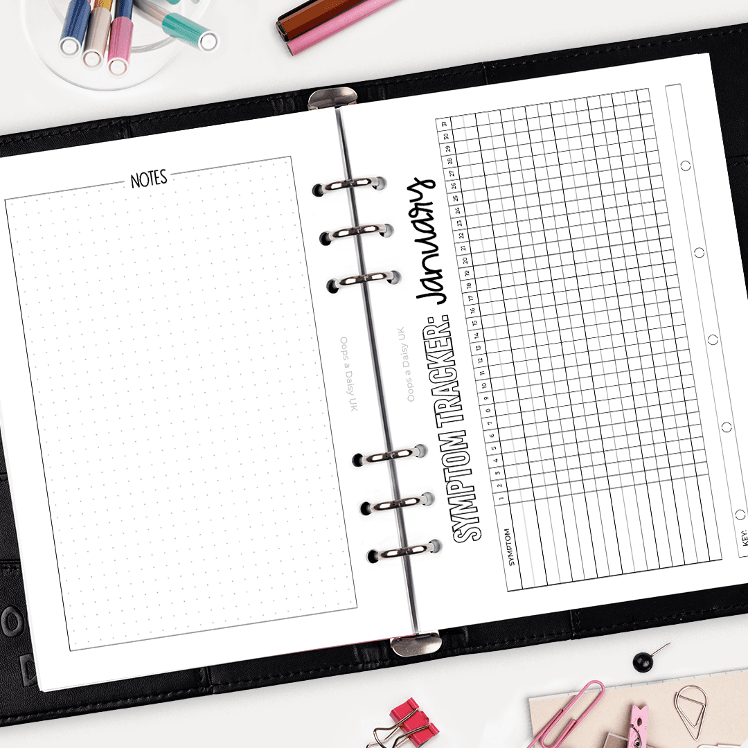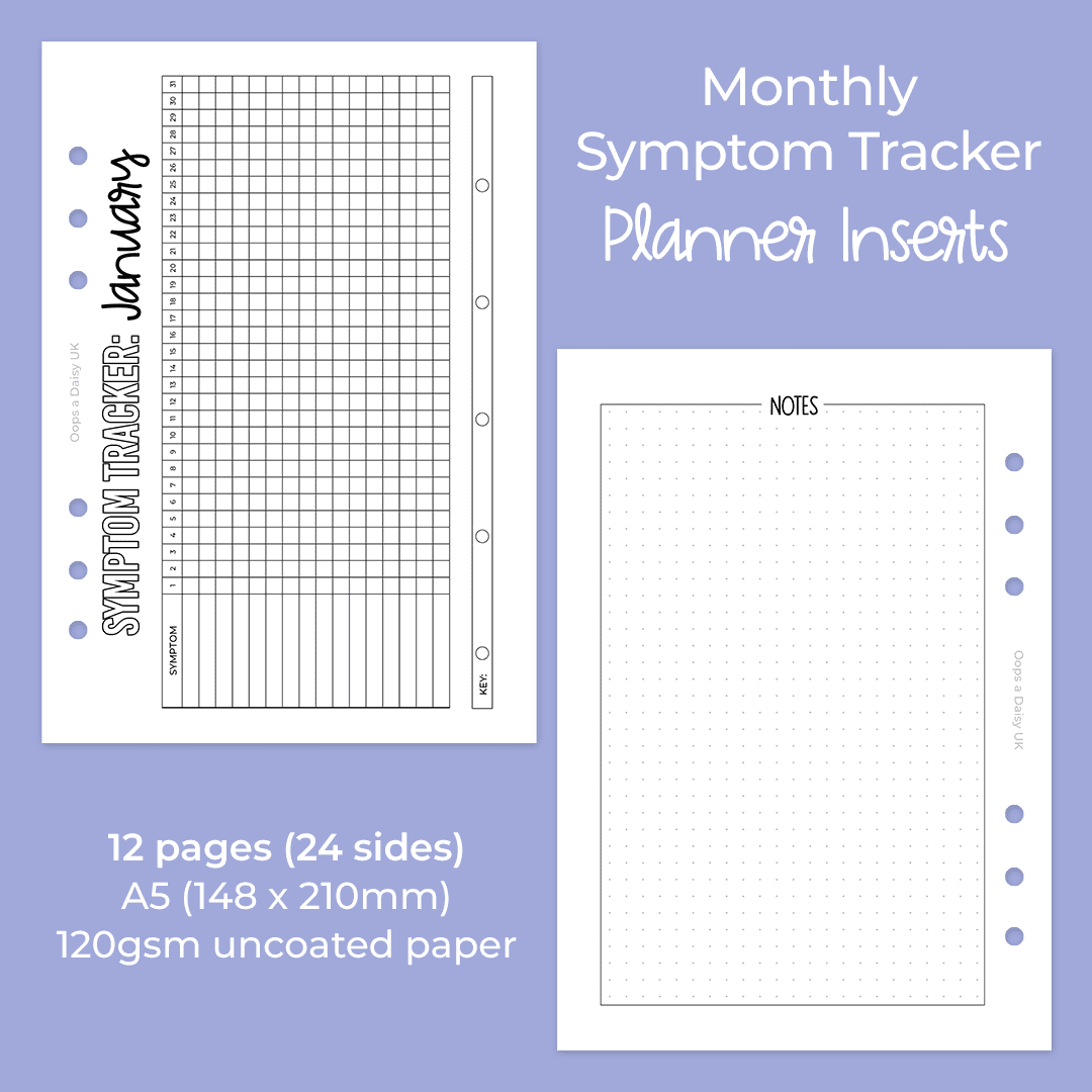 Our monthly symptom trackers are great for tracking multiple health symptoms throughout the months. Simply create a key using colours, numbers, or symbols, and then fill in each day to track your pain, mood, etc. The reverse features space for notes with a 5mm dot grid.
