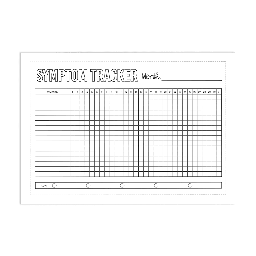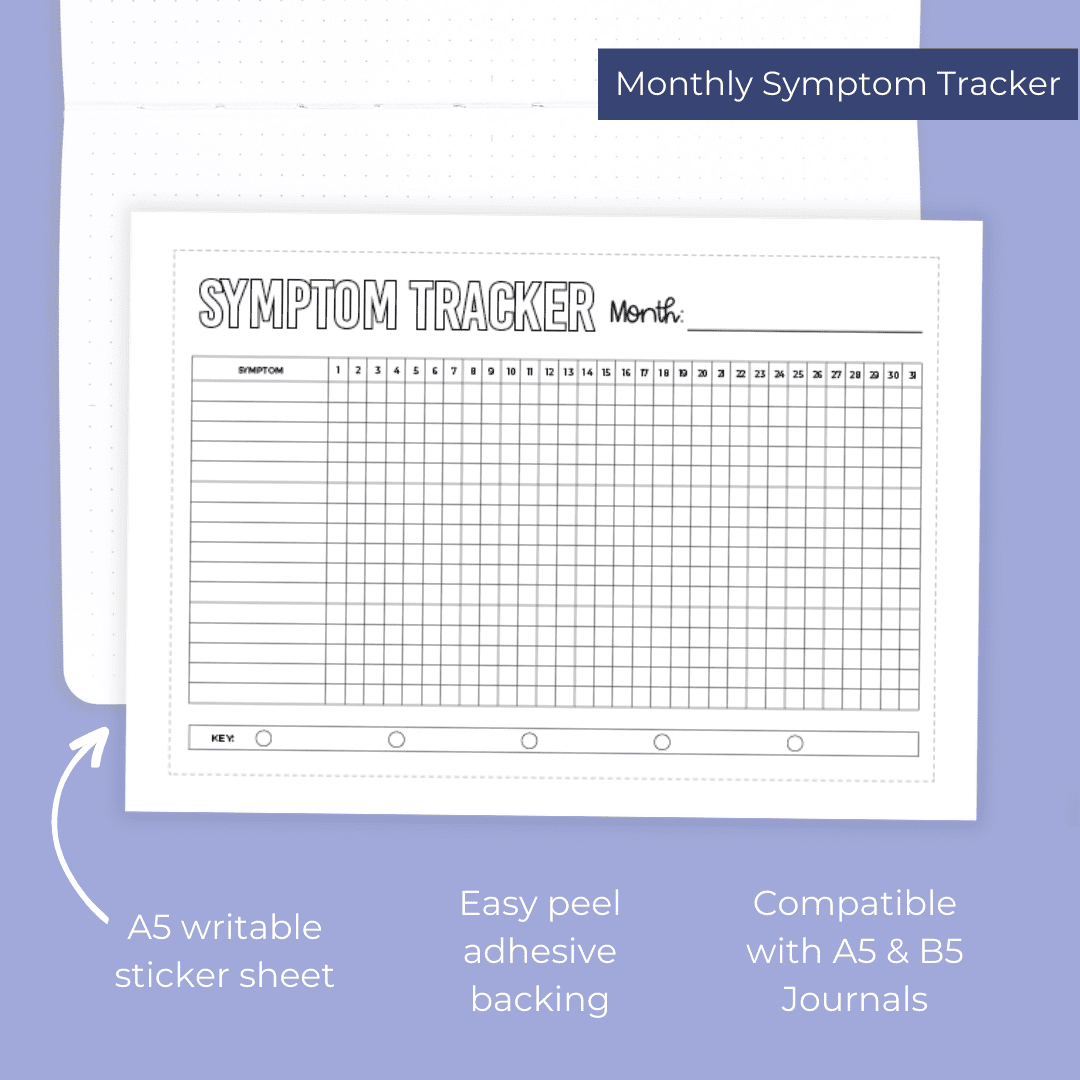 This monthly symptom tracker full-page journal sticker is designed to make spotting patterns feel straightforward and manageable. Covering an entire planner or journal page, it offers a clear grid to track up to 19 symptoms or moods day by day throughout the month, with numbered rows from 1 to 31 so it works for any month length. Perfect for tracking chronic illness symptoms, pain, mood, ADHD, neurodivergent traits, etc.