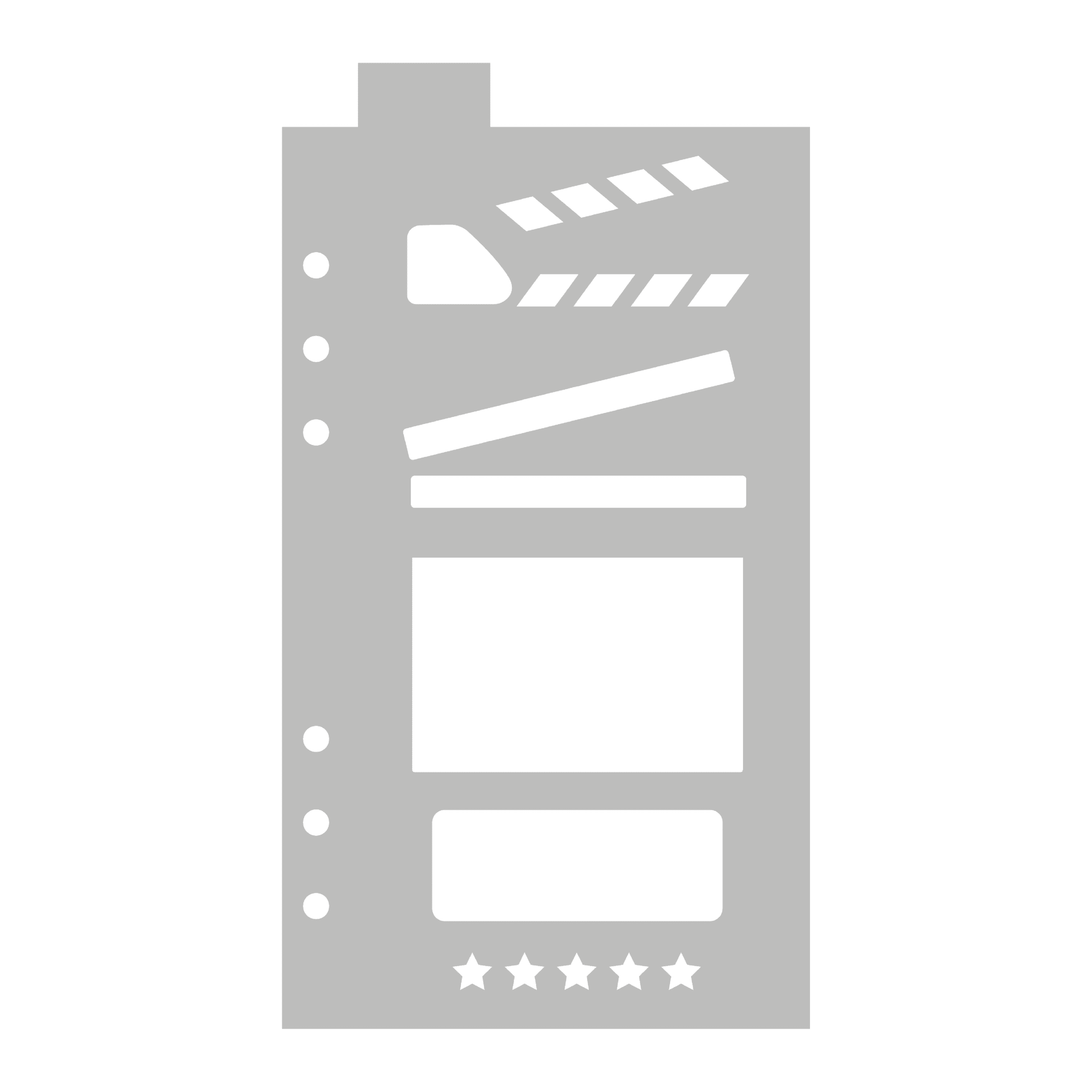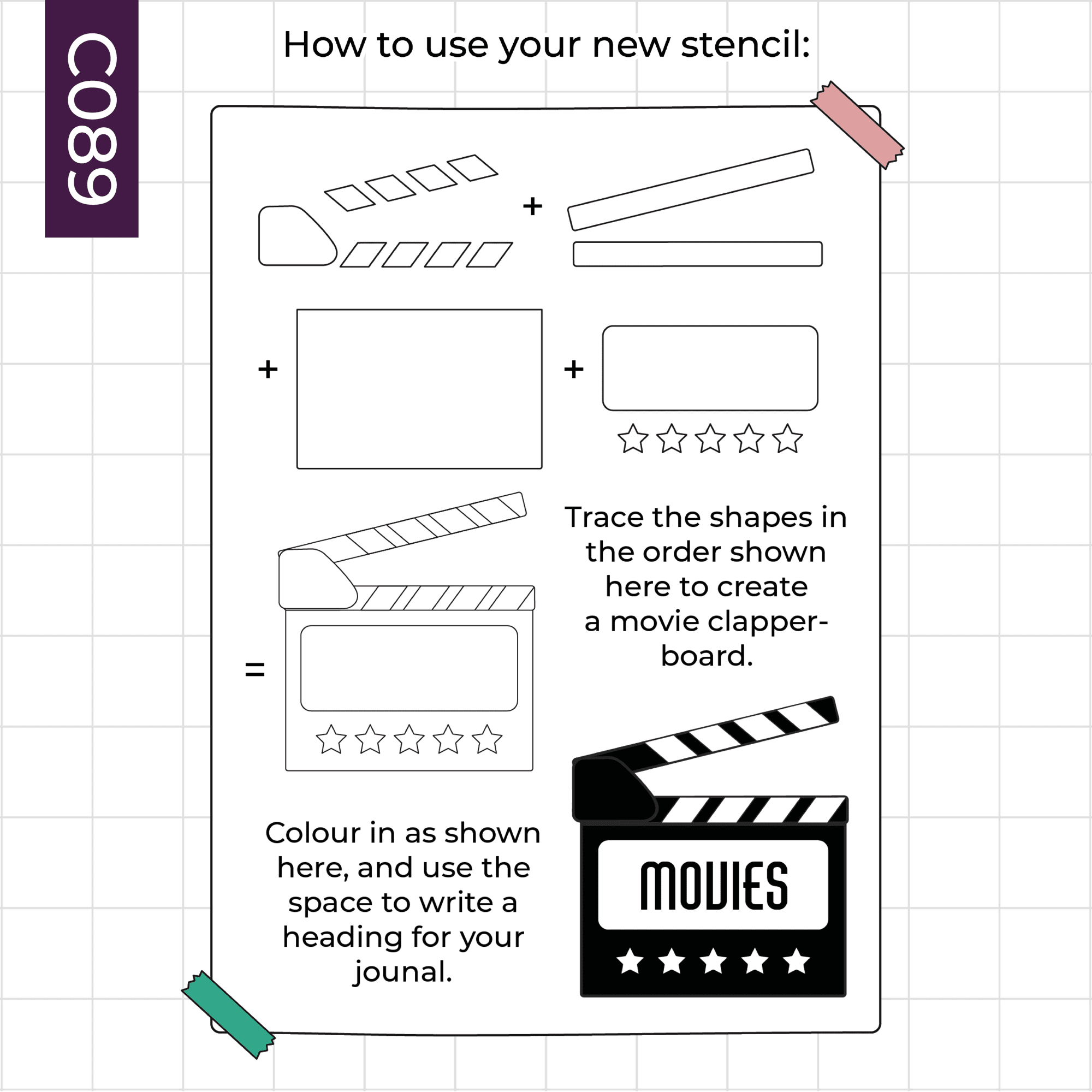 Calling all movie buffs! This handy journal stencil can be used to create and decorate a movie themed spread in your bullet journal. Featuring the outline and details of a movie clapper board, plus stars to help you write reviews!
