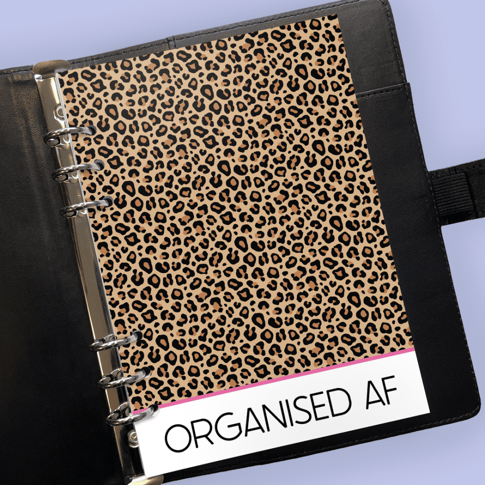 This dashboard features a stunning leopard print pattern with the text “Organised AF”. The inside front cover is a striking pink colour, with a clear corner pocket – Great for tucking notes, sticker sheets, receipts, etc.