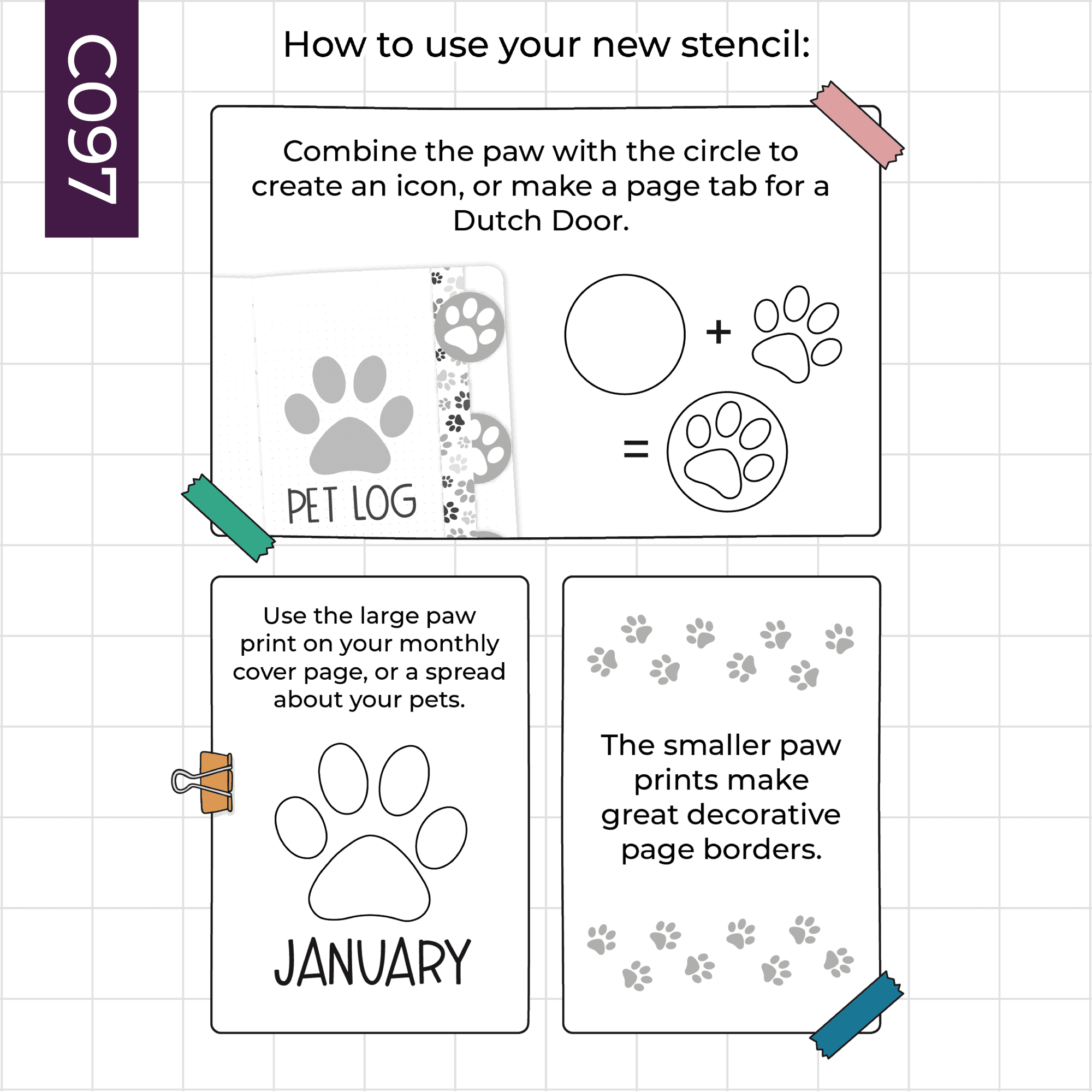 Inspired by our love of animals, this paw print themed stencil contains a number of motifs to make paw print decorations in your journal.