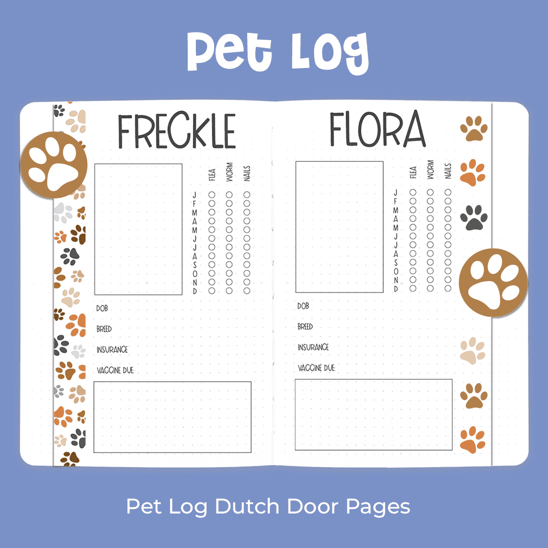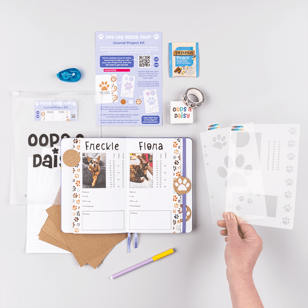 This kit is designed to help you set-up a pet tracker in your journal. With a place to include a photo of your pet, store all of their important details and record regular treatments such as flea, worming and grooming.