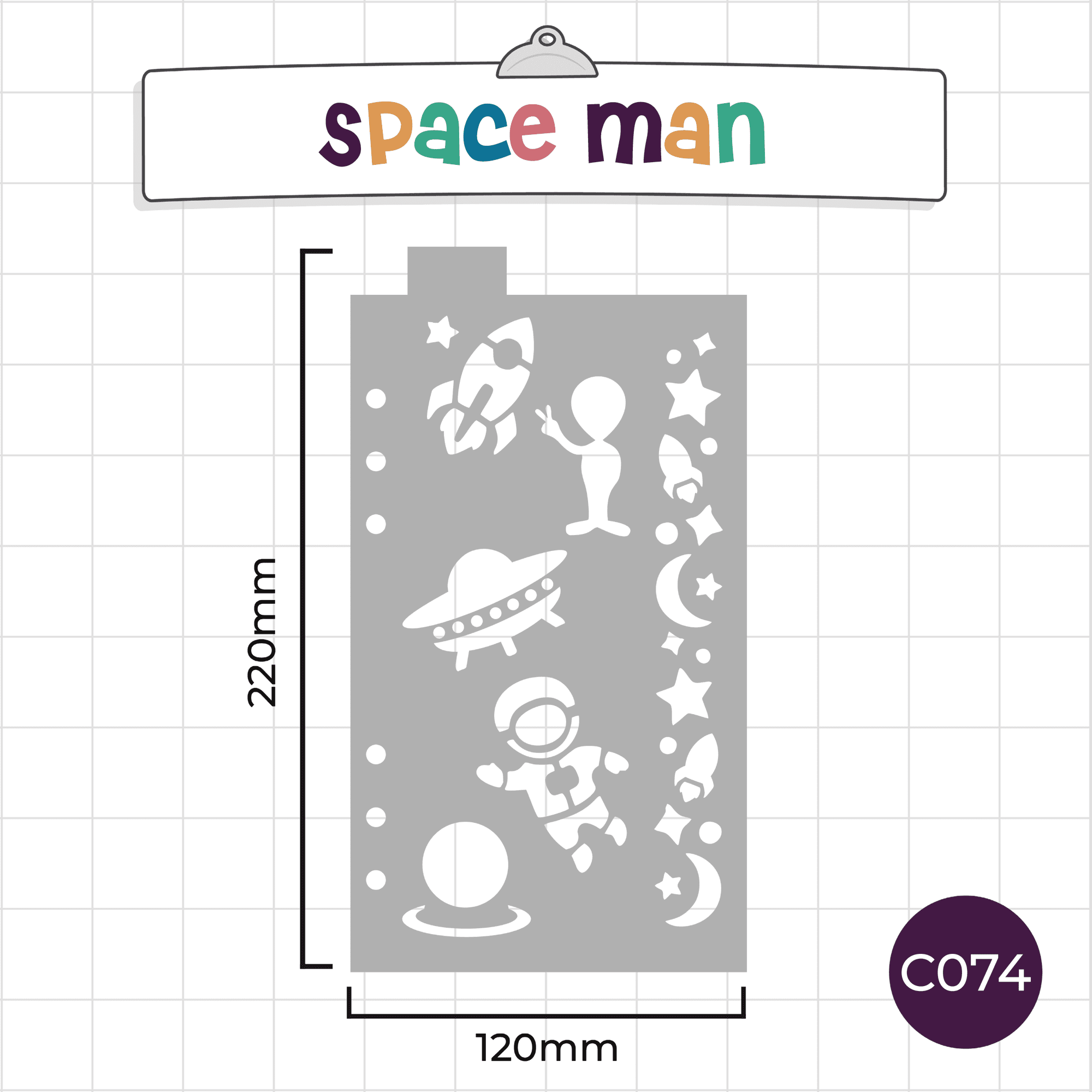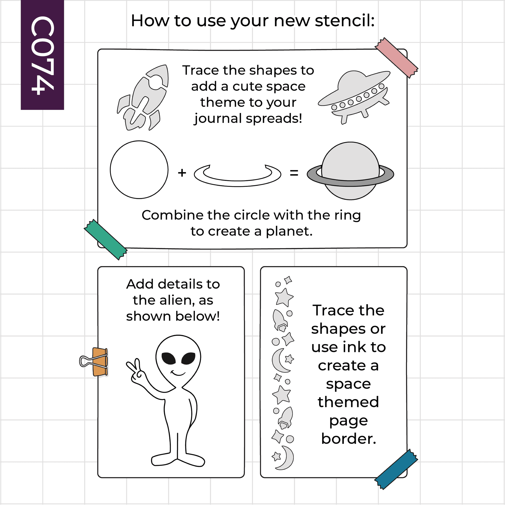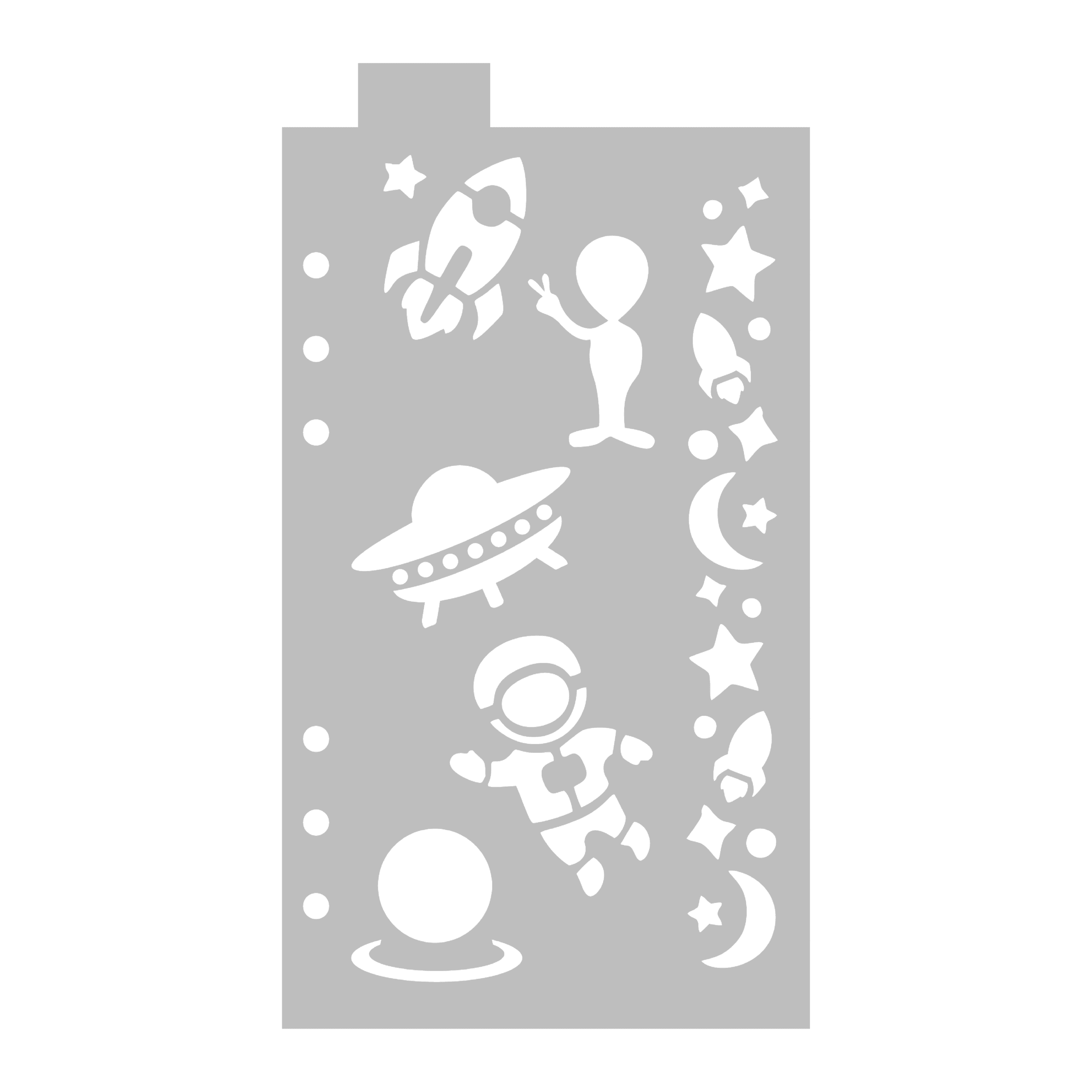 This stencil features a variety of designs inspired by our imaginary travels to outer space! An astronaut, planets, a rocket and a friendly alien!