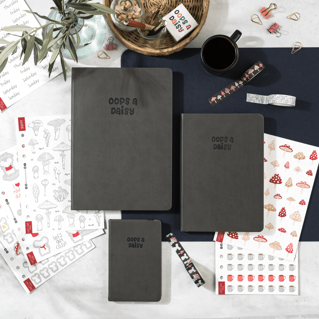 This A6 dotted journal features a gorgeous charcoal grey faux-leather cover, de-bossed with the Oops a Daisy logo.