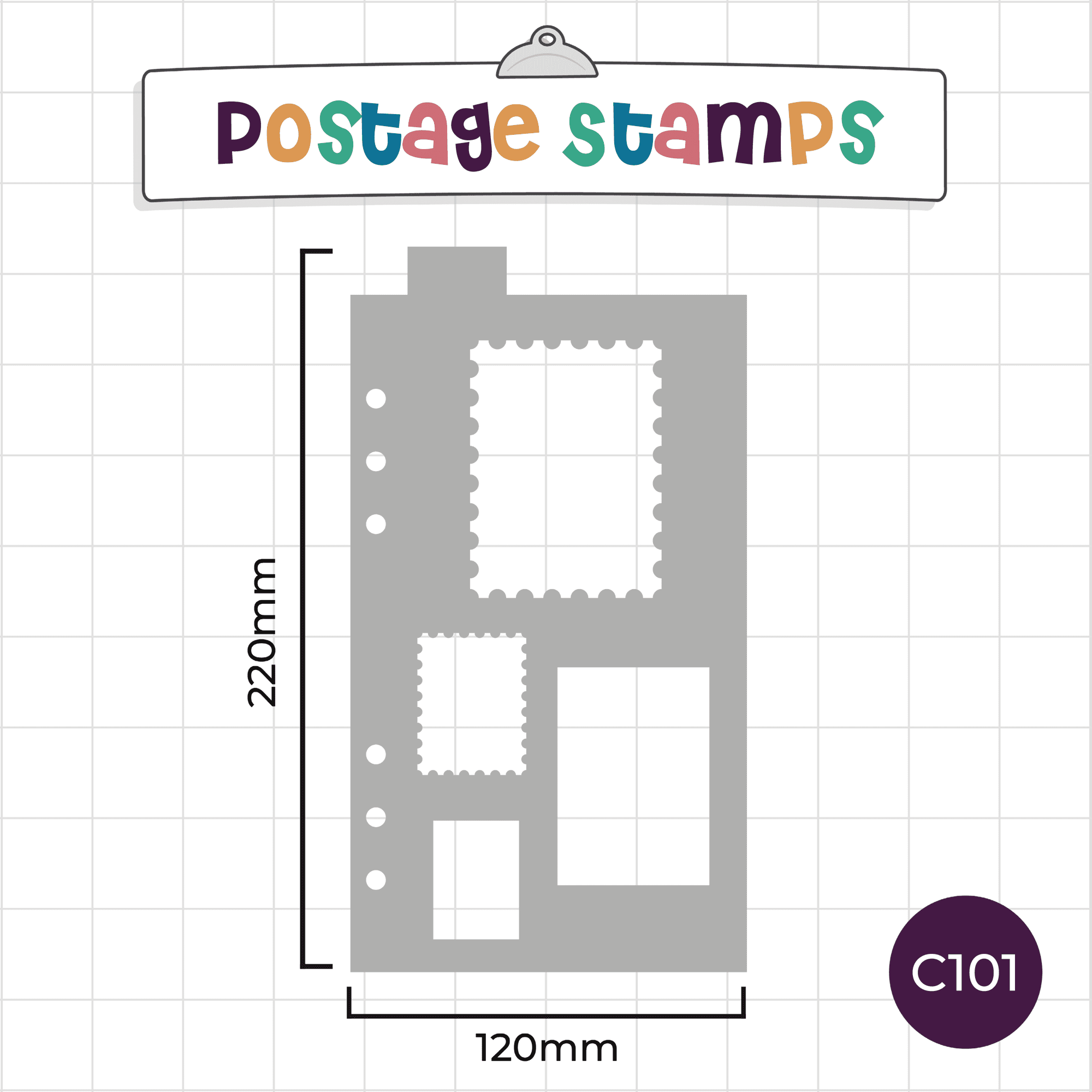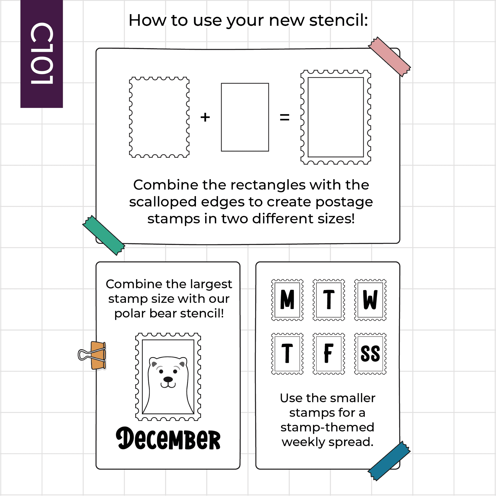 This stencil features elements to help you create two different sizes of postage stamps. This stencil was designed with work with our Polar Bear stencil (C100) to create cute festive stamps!