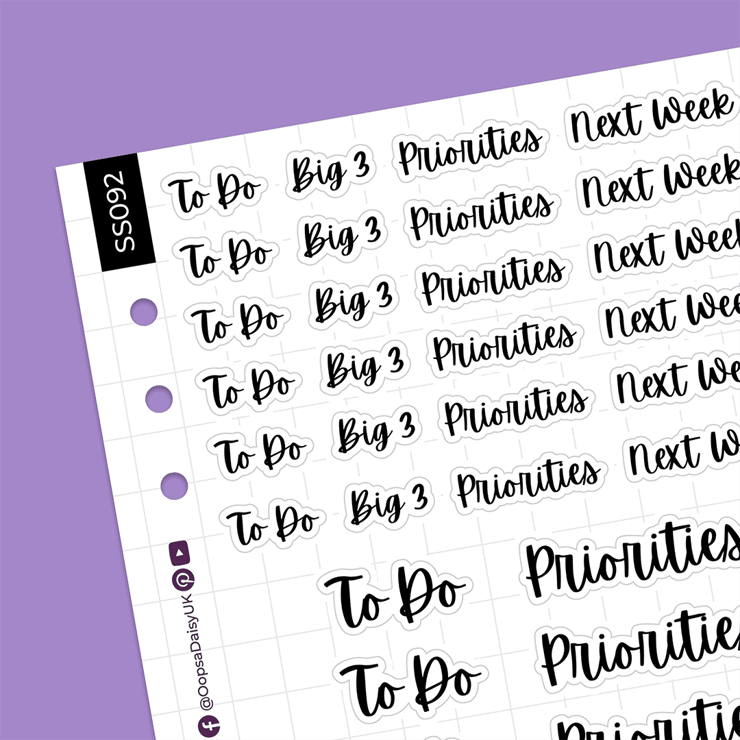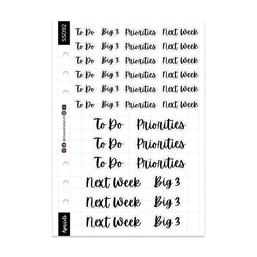 Each sheet contains 9 sets of headers in two different sizes, featuring the headers ‘To Do’, ‘Big 3’, ‘Priorities’ and ‘Next Week’.