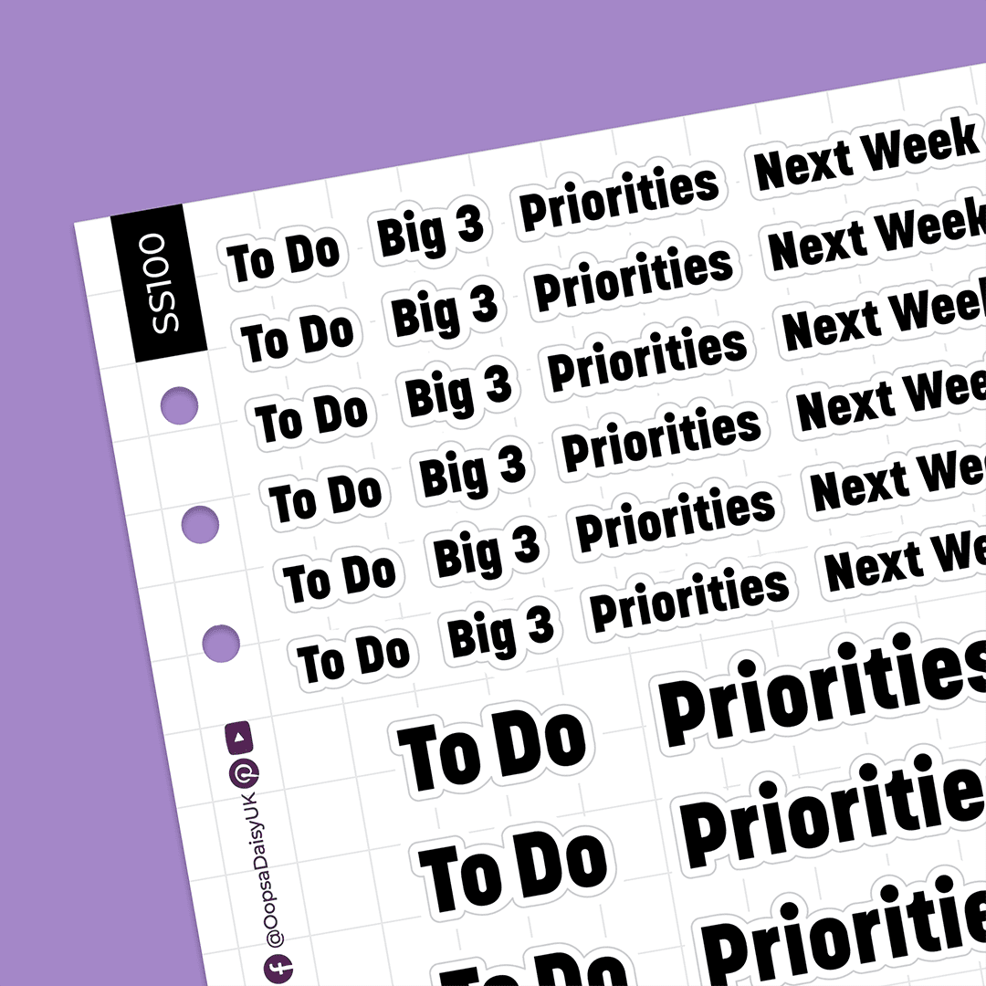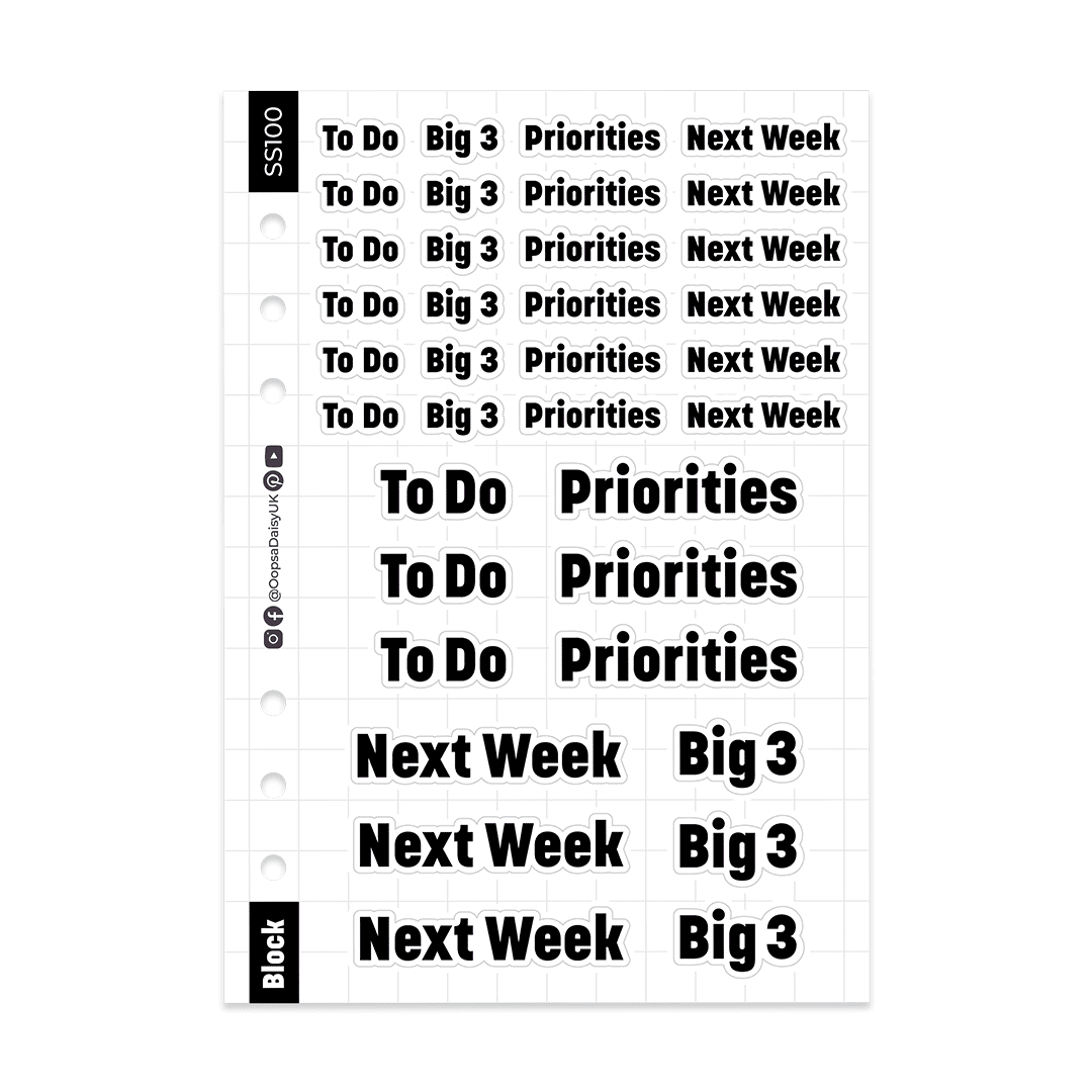 Each sheet contains 9 sets of headers in two different sizes, featuring the headers ‘To Do’, ‘Big 3’, ‘Priorities’ and ‘Next Week’.