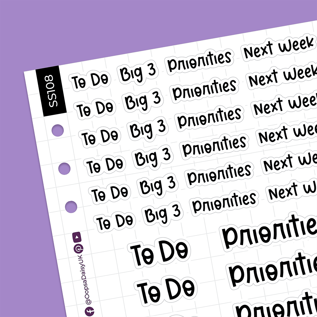 Each sheet contains 9 sets of headers in two different sizes, featuring the headers ‘To Do’, ‘Big 3’, ‘Priorities’ and ‘Next Week’.