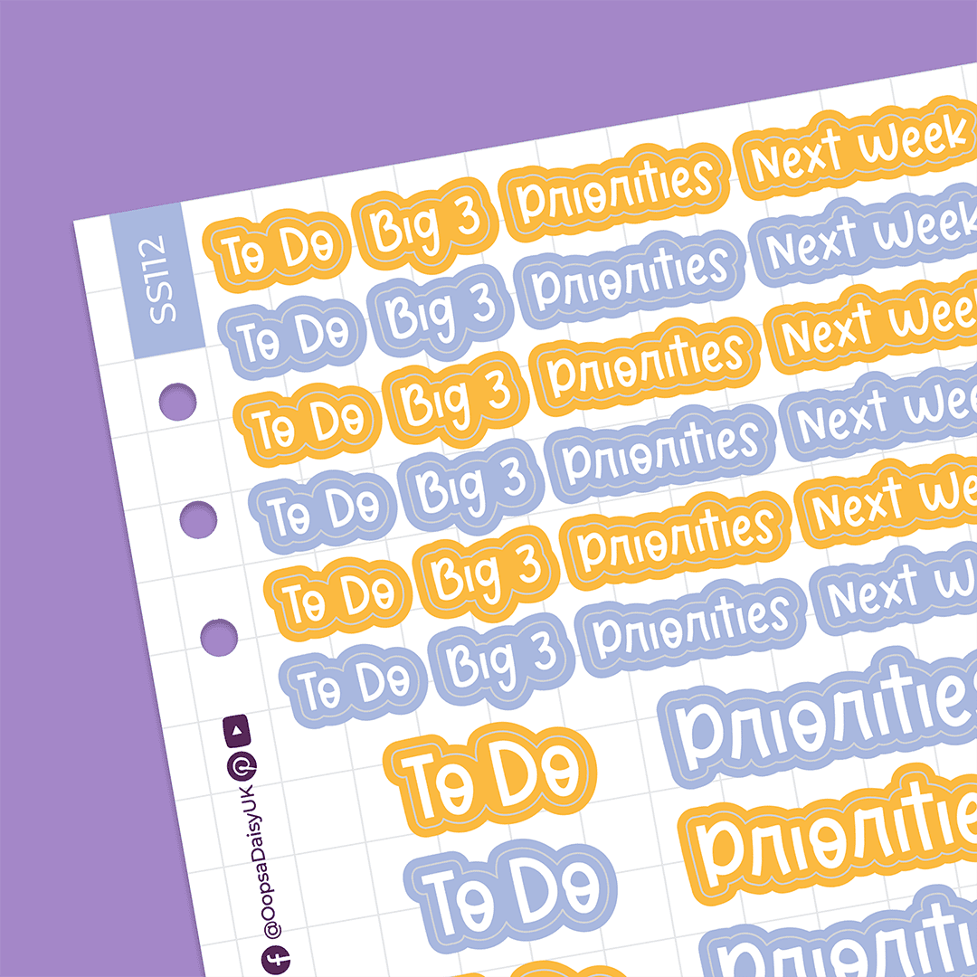 Each sheet contains 9 sets of headers in two different sizes, featuring the headers ‘To Do’, ‘Big 3’, ‘Priorities’ and ‘Next Week’.