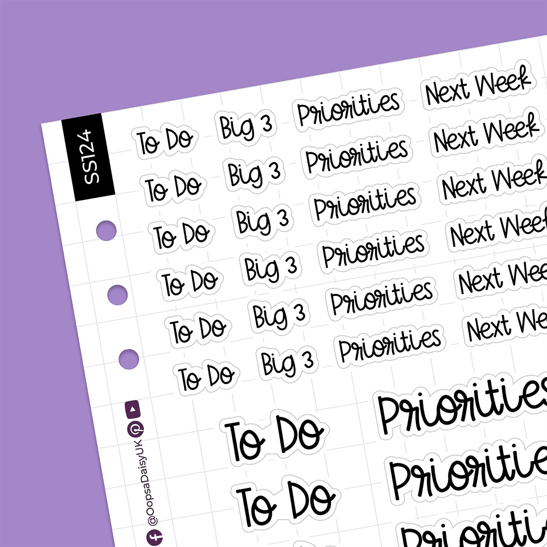 Each sheet contains 9 sets of headers in two different sizes, featuring the headers ‘To Do’, ‘Big 3’, ‘Priorities’ and ‘Next Week’.