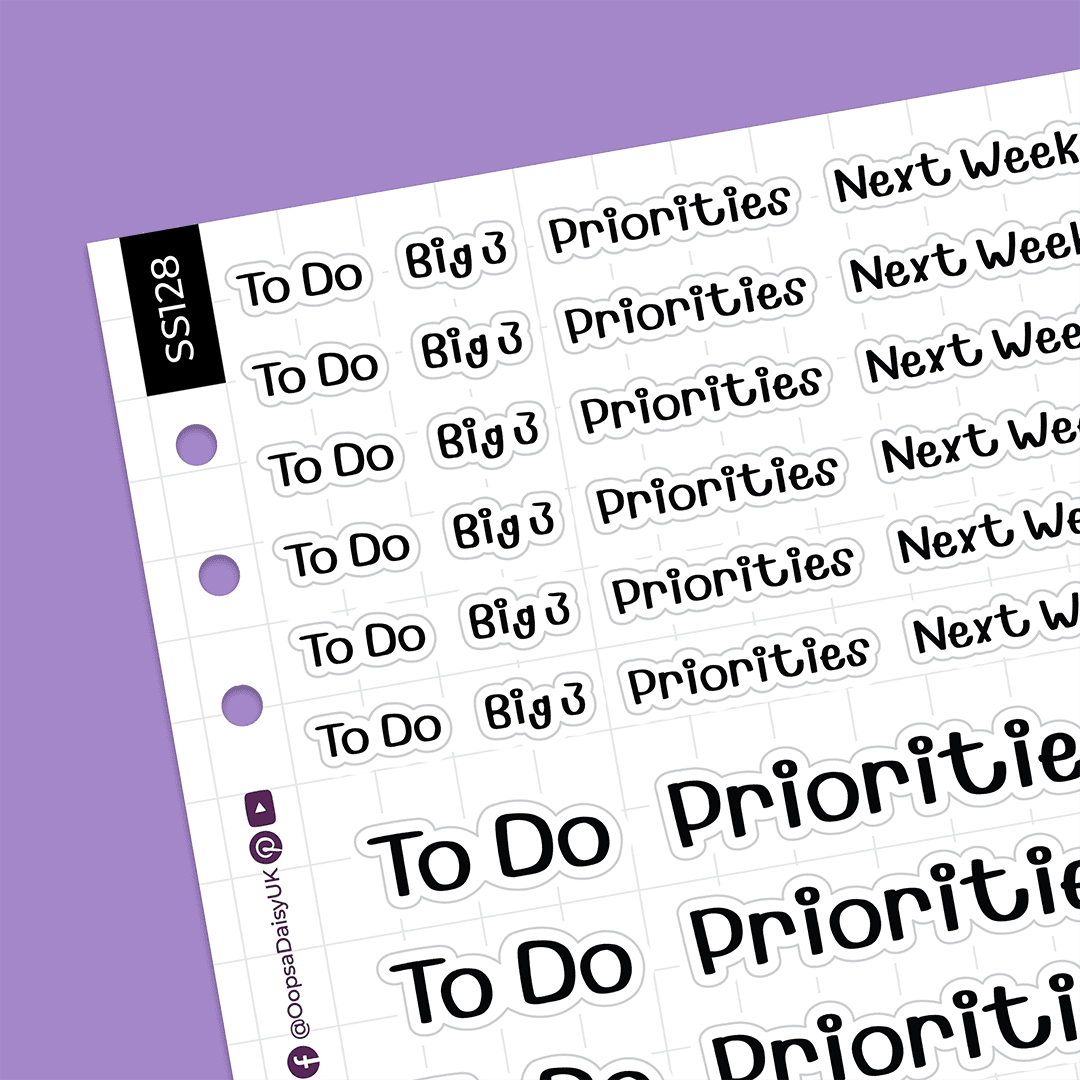 Each sheet contains 9 sets of headers in two different sizes, featuring the headers ‘To Do’, ‘Big 3’, ‘Priorities’ and ‘Next Week’.