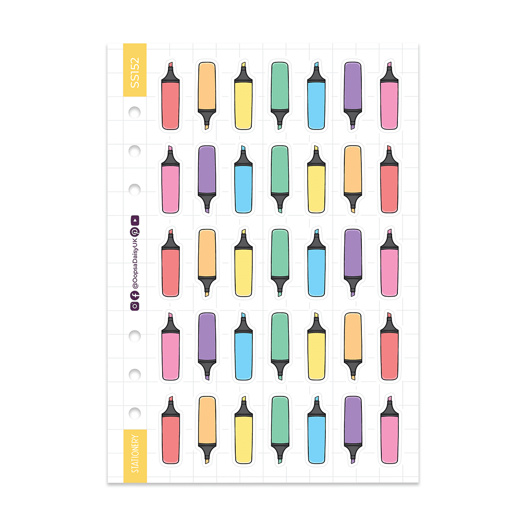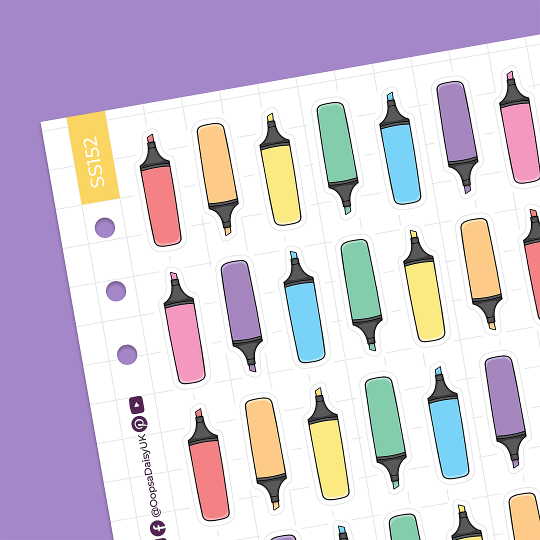 Brighten up your journal or planner with these rainbow highlighter stickers. The sheet includes 35 stickers, featuring cute highlighter pens in our signature rainbow colours.
