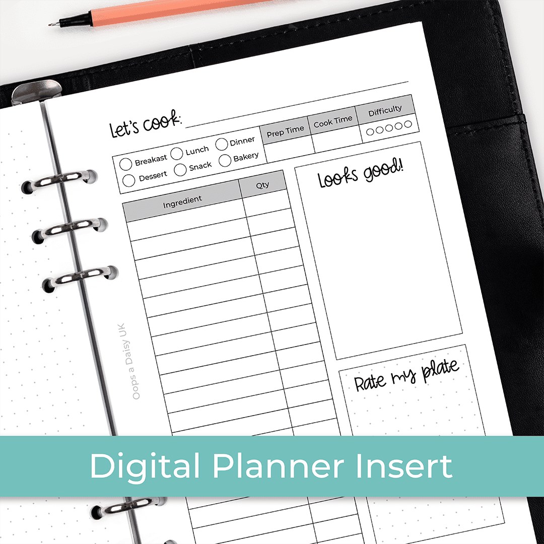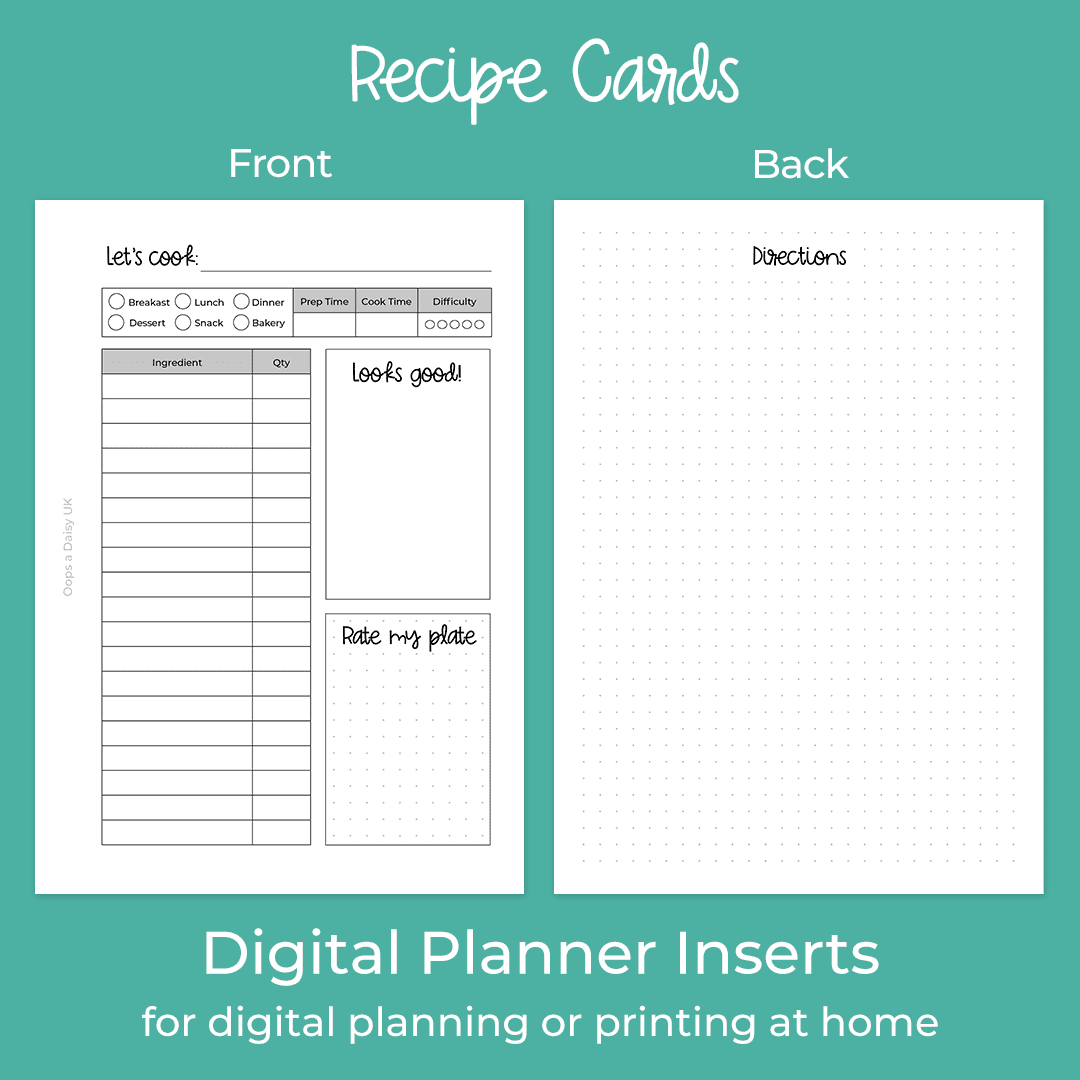 Our recipe card planner inserts are perfect for creating your very own recipe book using one of our Hybrid Planner Binders! The front side features spaces for ingredients, cook time, servings, and notes, and the reverse has a 5mm dot grid area for writing the method, or any other notes you have.