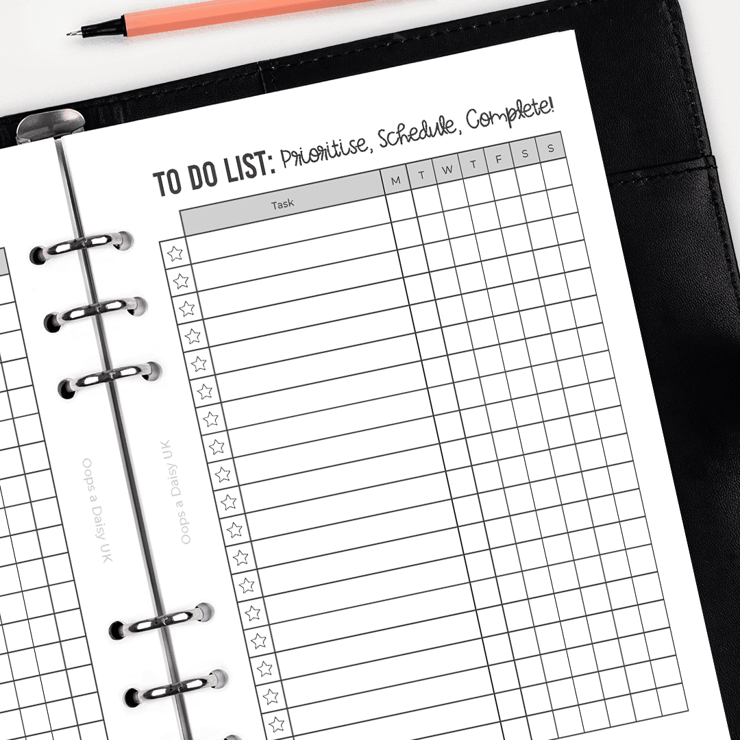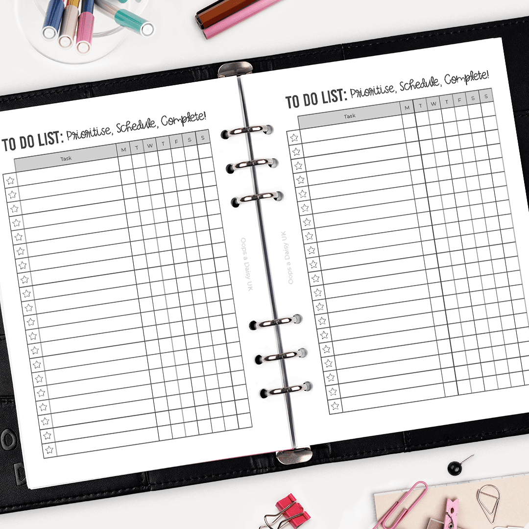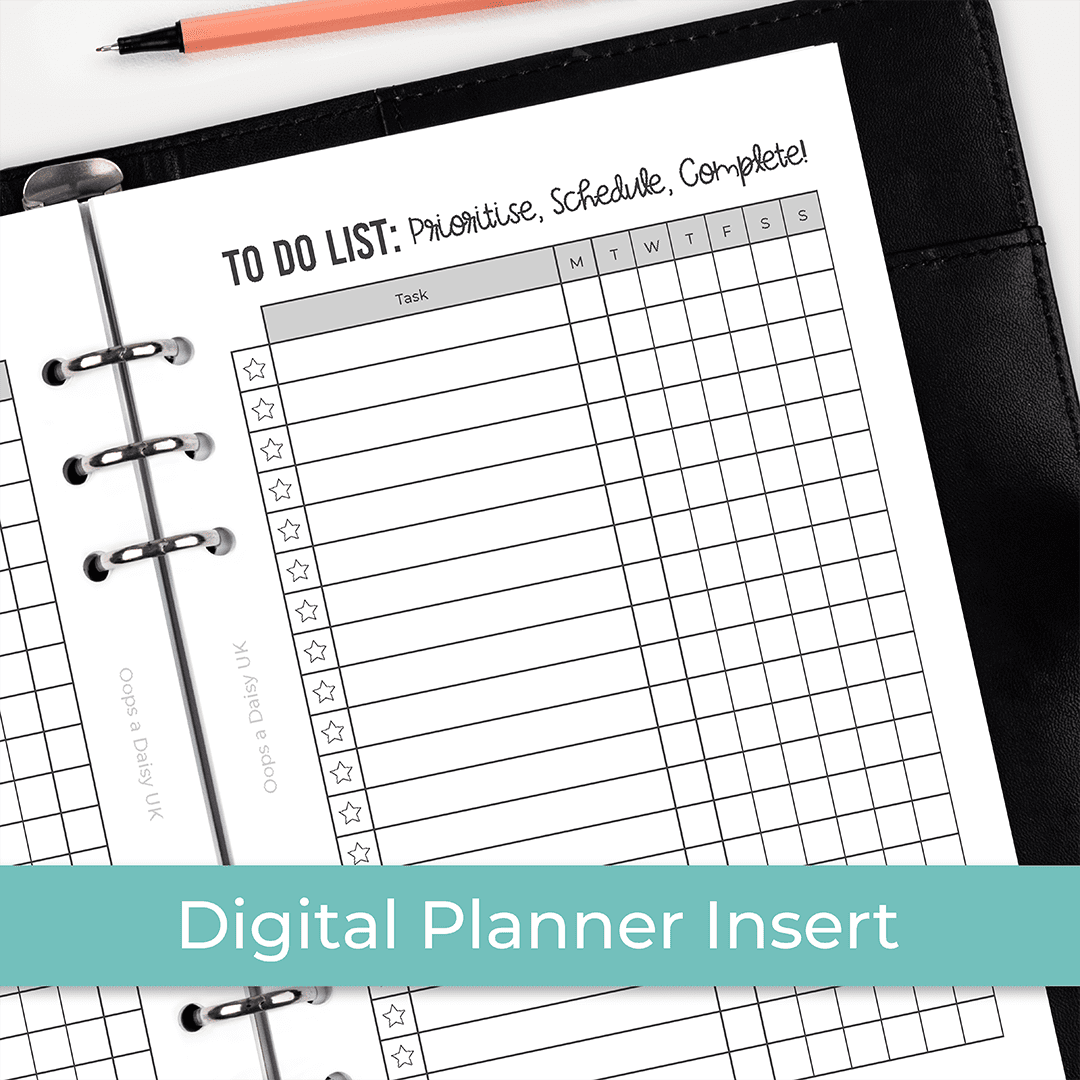 Our rolling to do list planner inserts are perfect for when you need to get organised! Simply write your tasks in the first column and mark the day you will complete the task. Choose from Monday or Sunday start, and a variety of punch styles to fit your planner.