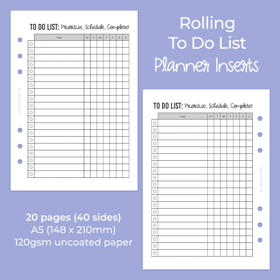 Our rolling to do list planner inserts are perfect for when you need to get organised! Simply write your tasks in the first column and mark the day you will complete the task.