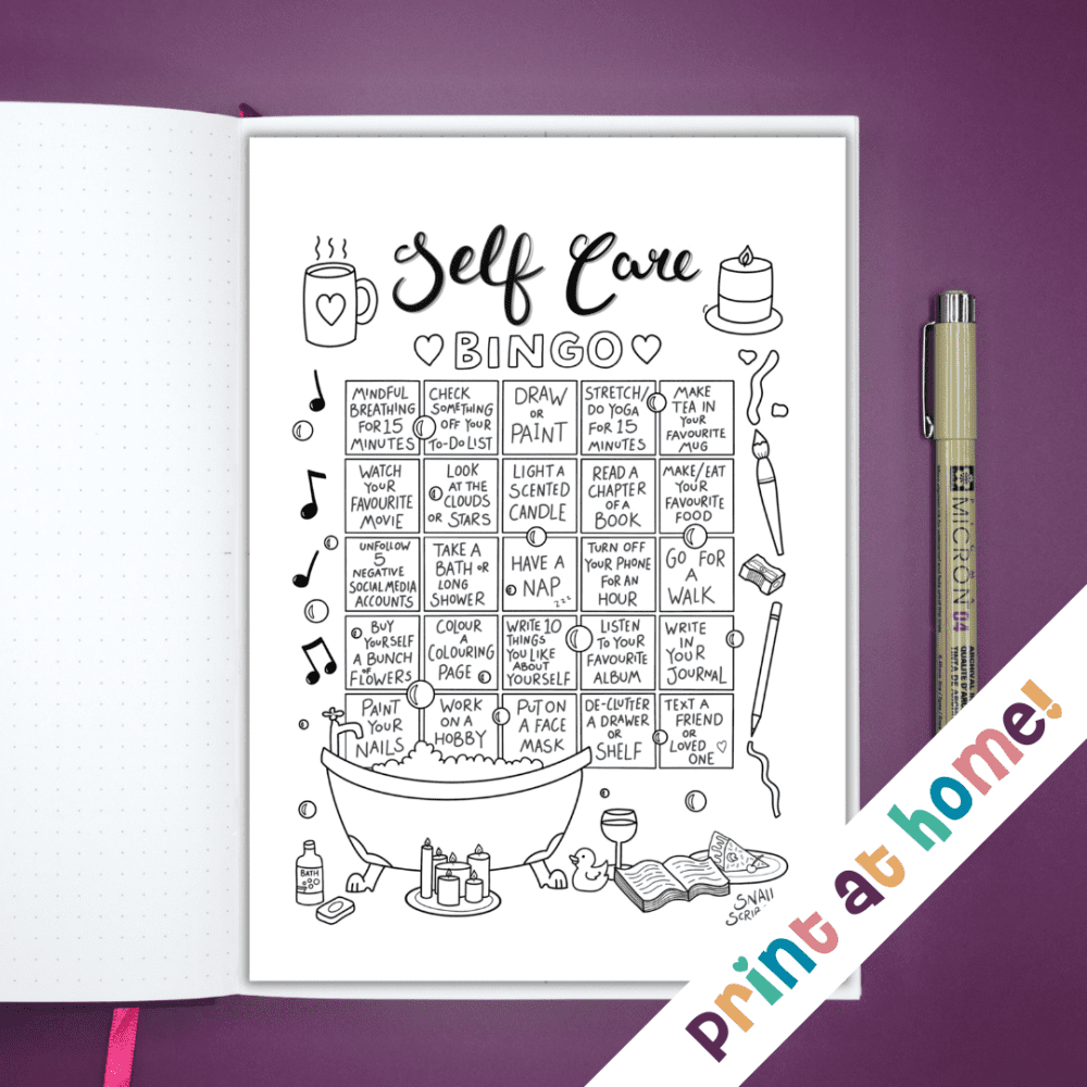Available with blank squares to fill in yourself or ready-made full of simple self-care ideas – Colour a square for every moment of me-time! Â