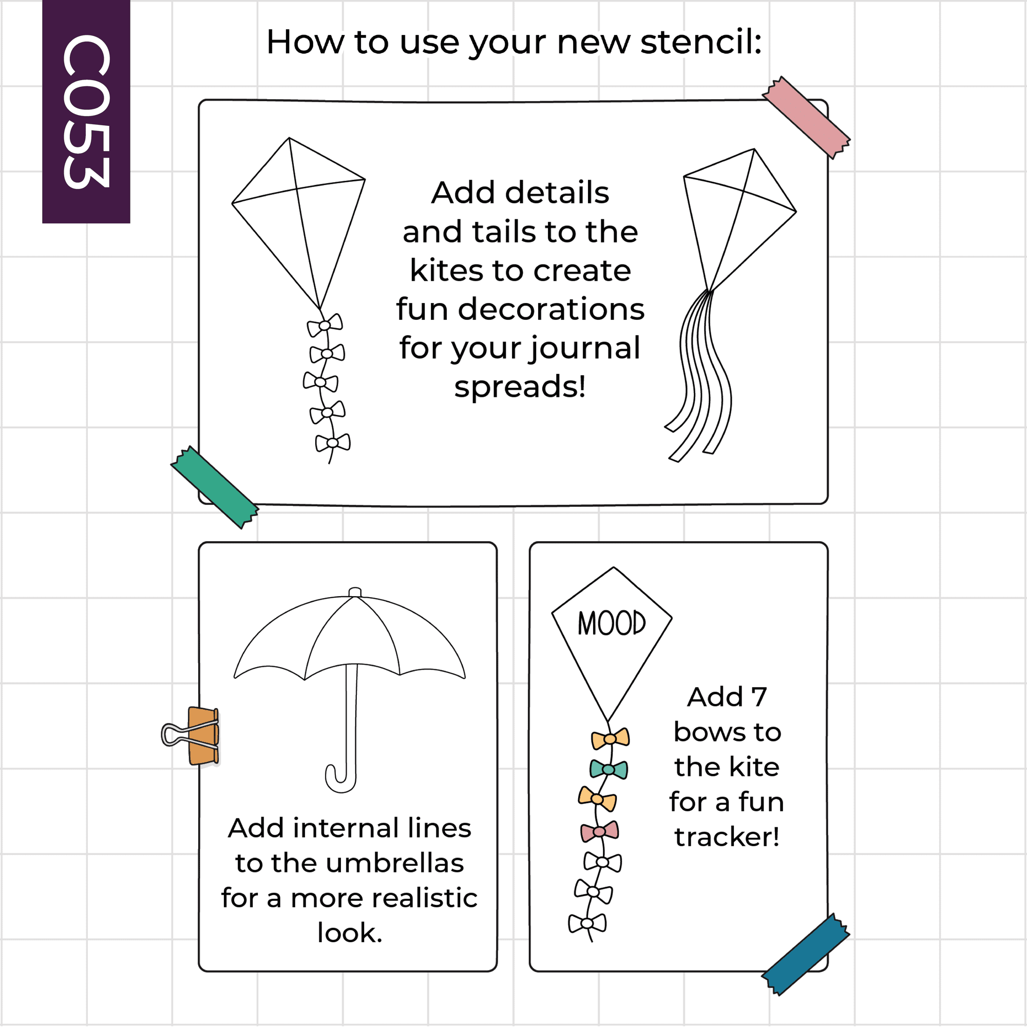 This cute journal stencil features various spring icons, including wellies, umbrellas and kites, to help you create fun spring-themed spreads in your bullet journal.