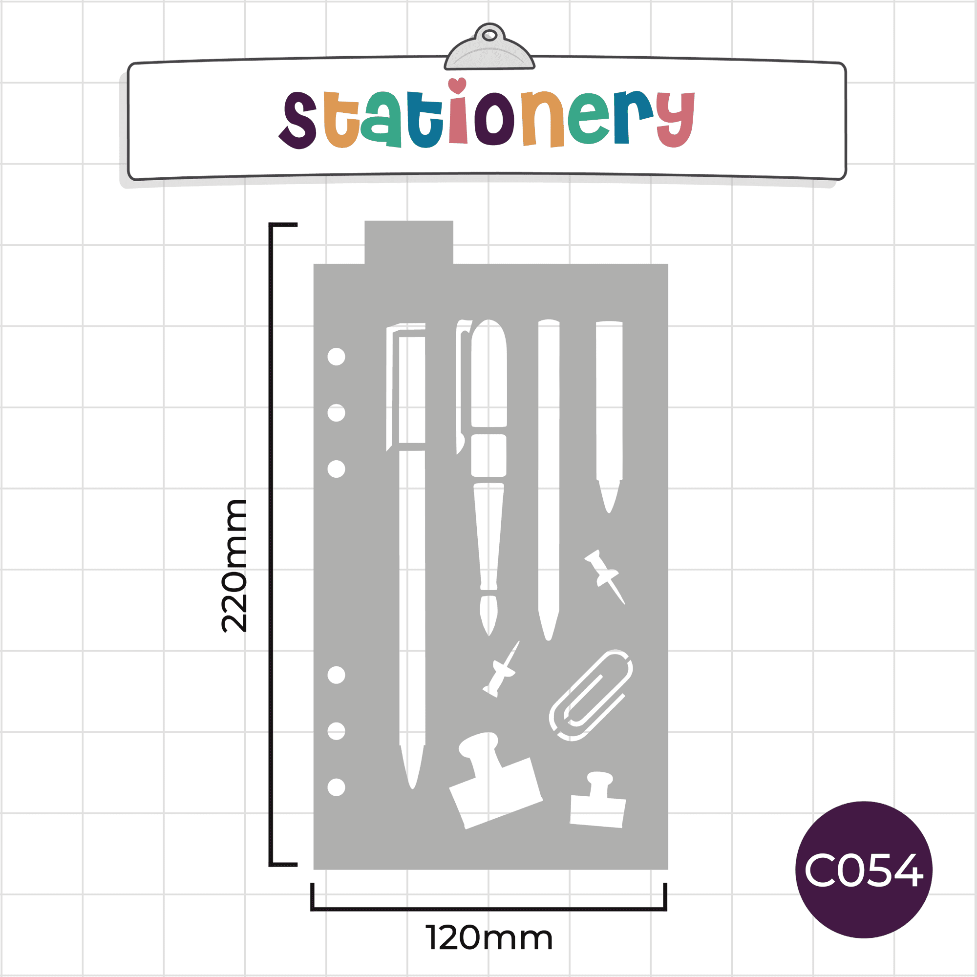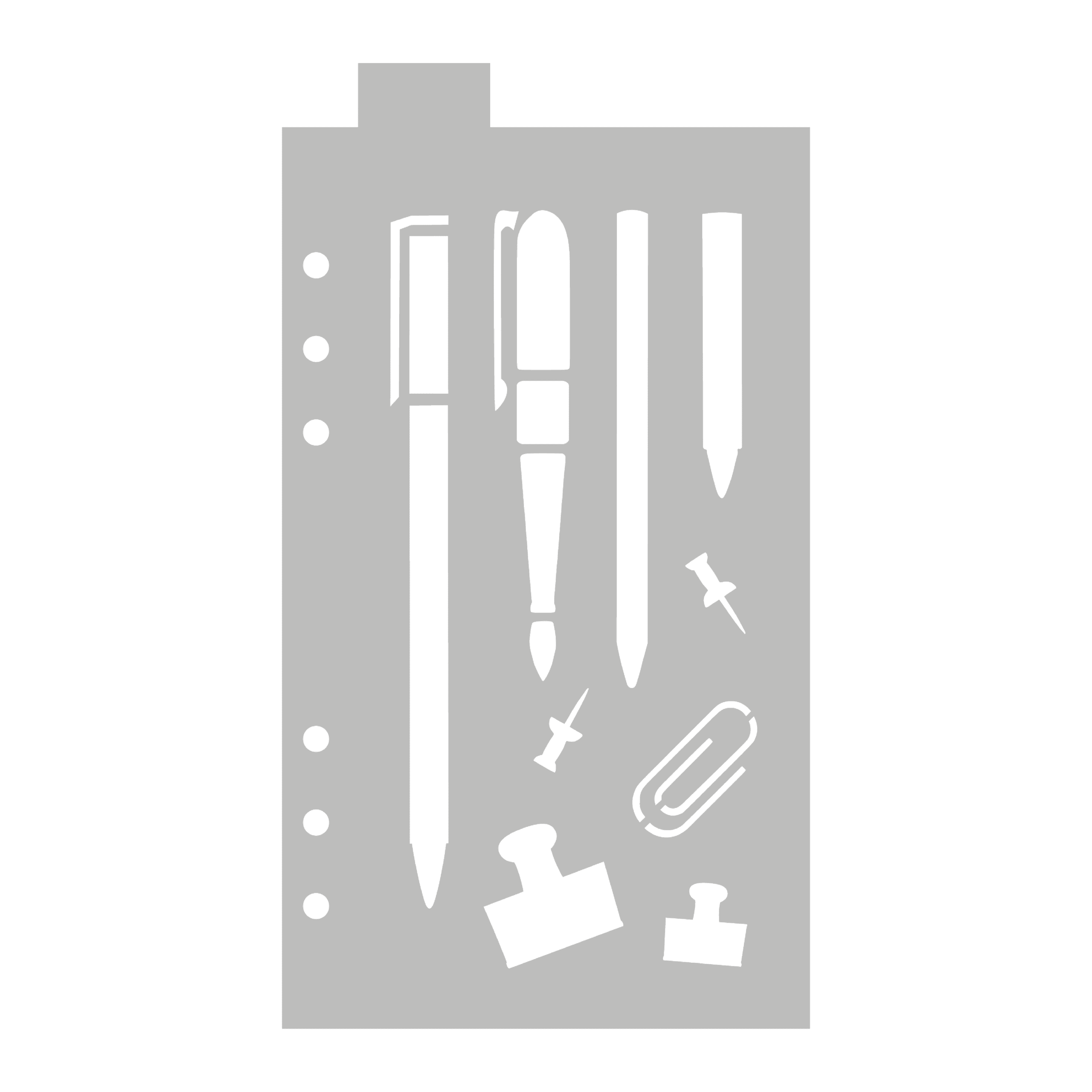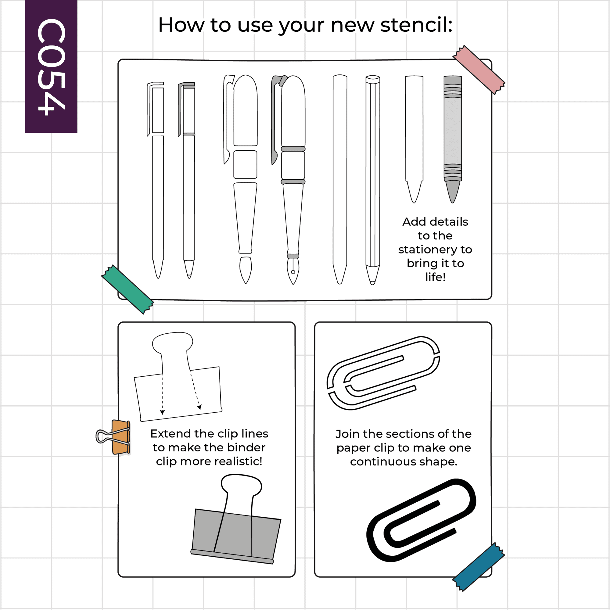 This stationery themed bullet journal stencil features pens, a pencil, a crayon, drawing pins, paperclips bulldog clips – Use it to decorate your journal spreads with a funky stationery theme!