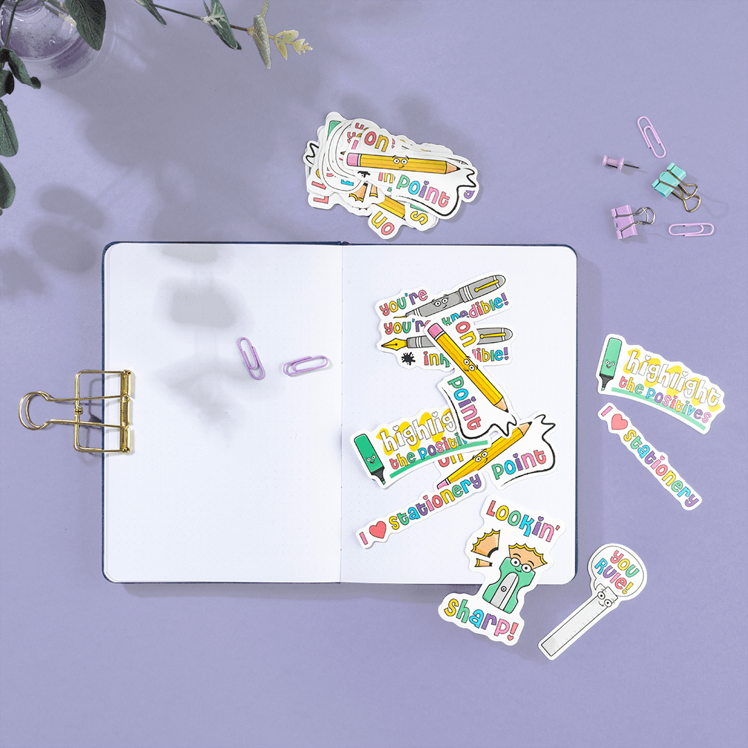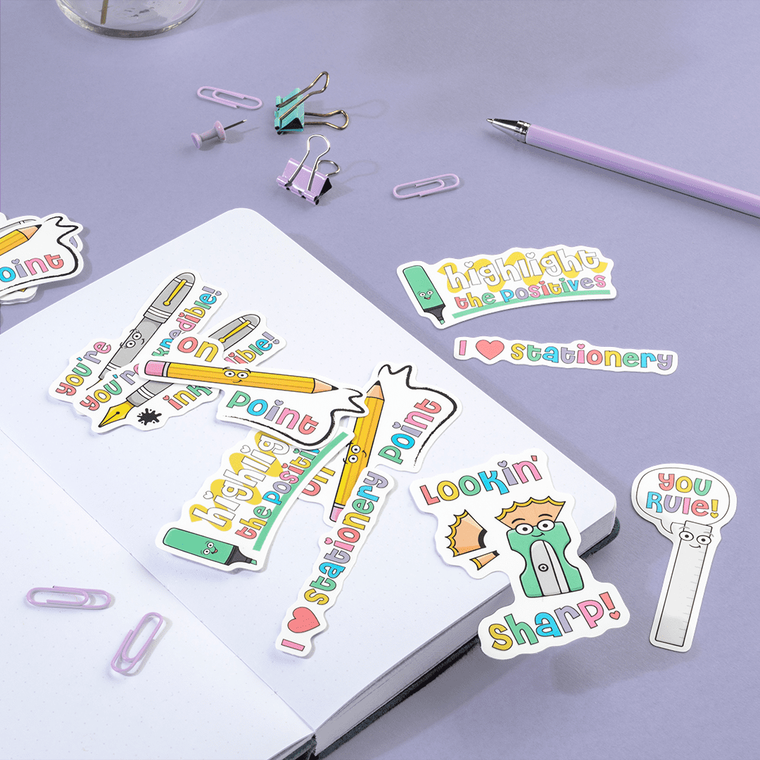 Created for our collaboration with The Positive Teacher Company, this pack of vinyl stickers features 24 stickers with 6 different stationery themed puns and designs: