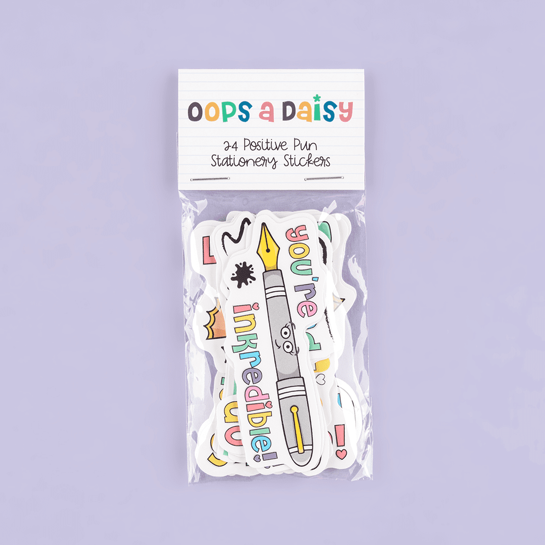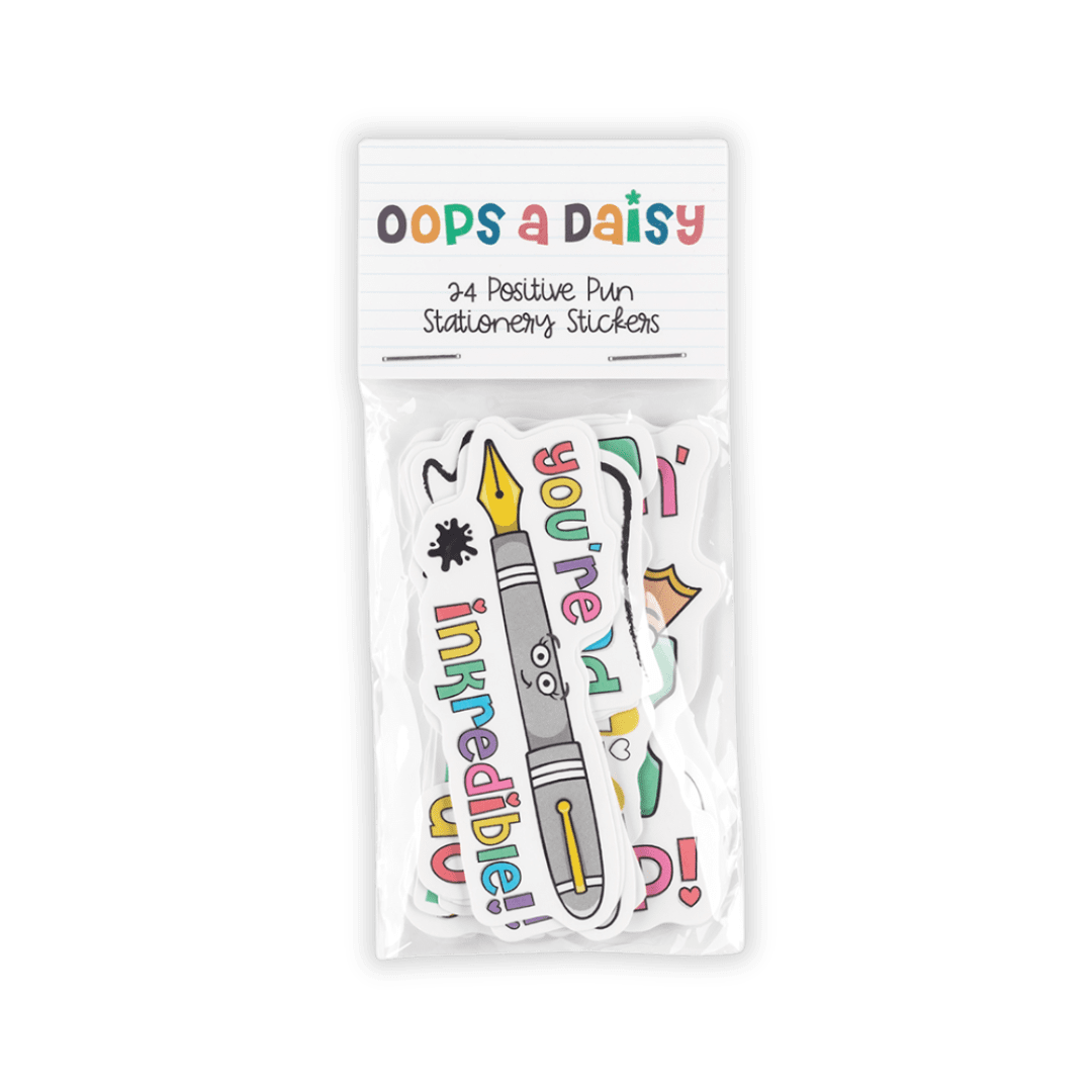 Created for our collaboration with The Positive Teacher Company, this pack of vinyl stickers features 24 stickers with 6 different stationery themed puns and designs.