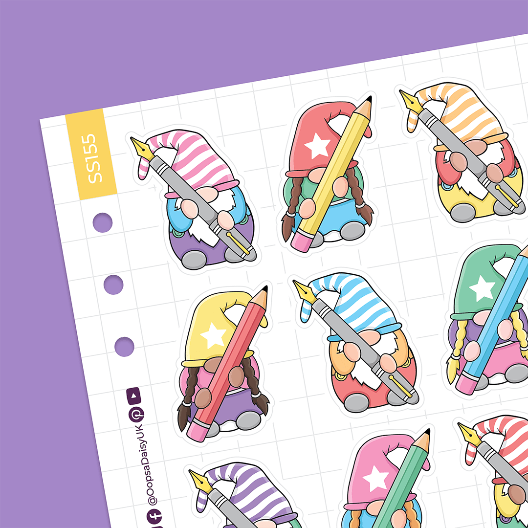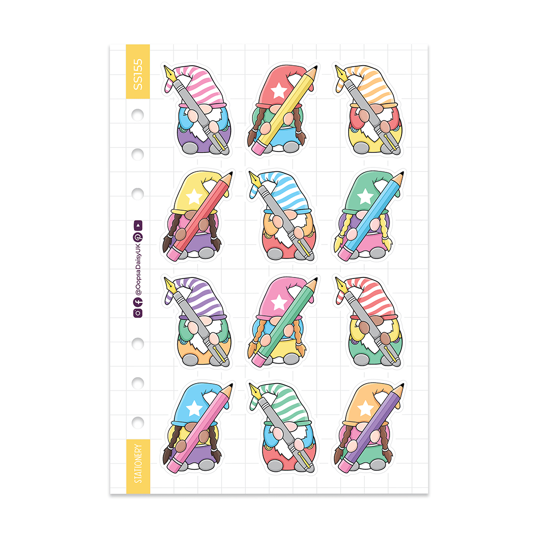 Brighten up your journal or planner with these super cute Stationery Gonk stickers. The sheet includes 12 stickers featuring a variety of rainbow-coloured gonks holding pens and pencils.