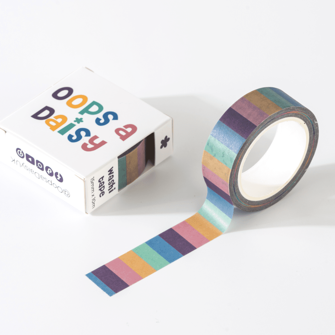 This Super Stripes Washi Tape features bold, multicolour vertical stripes. Clean, modern, and versatile, it’s perfect for adding colour without overwhelming your pages.