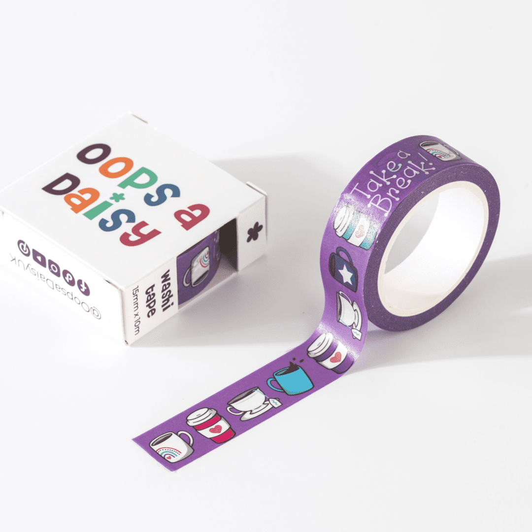 This Take a Break Washi Tape features a cosy mix of illustrated coffee cups, mugs, kettles, and the reminder “Take a break!” on a rich purple background. It’s perfect for marking rest days, self-care moments, or gentle reminders in your journal or planner.
