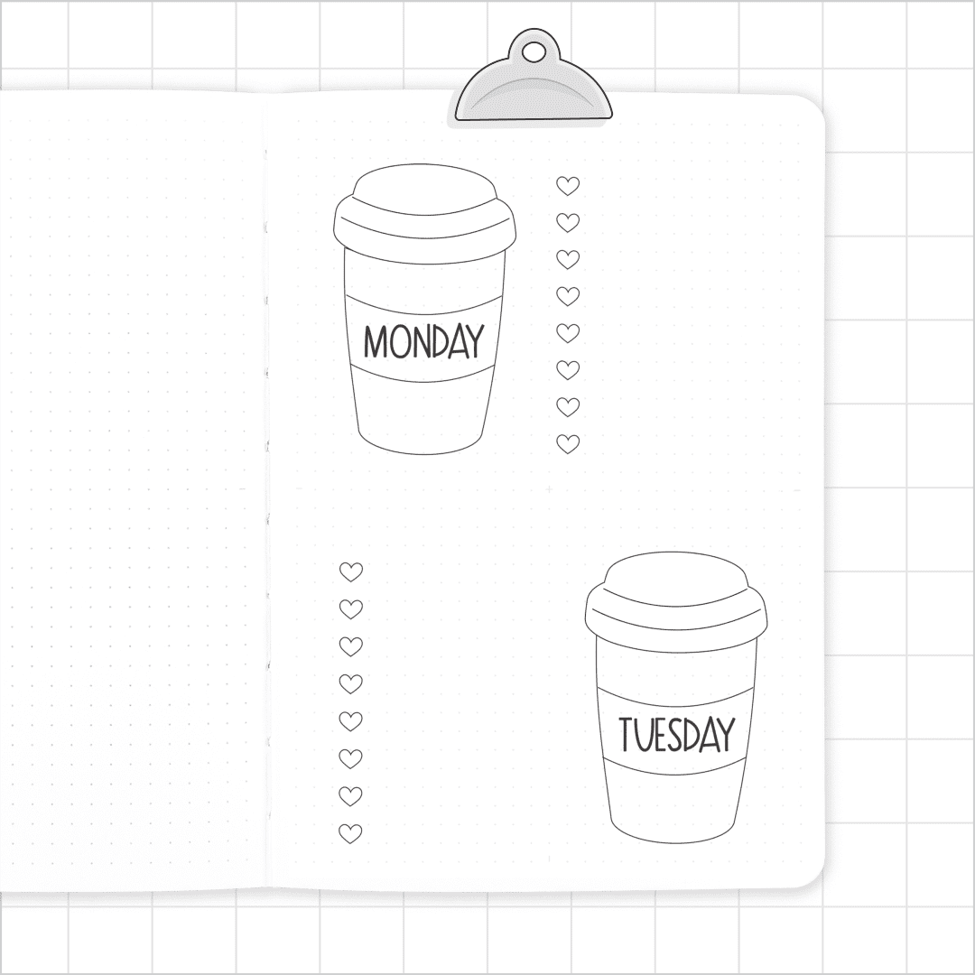 This journal stencil will help you create two coffee-themed lists on a page in your bullet journal. Use it for your daily to-do lists, a weekend spread, or as a weekly tracker!
