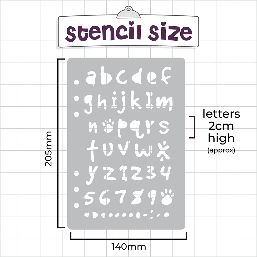 Available as two A5 stencils, with uppercase and lowercase letters, numbers, and punctuation. Designed for journal and planner use, the stencils fit neatly on the page and are easy to align, helping you create consistent lettering while adding personality and a whimsical feel to your everyday journaling.