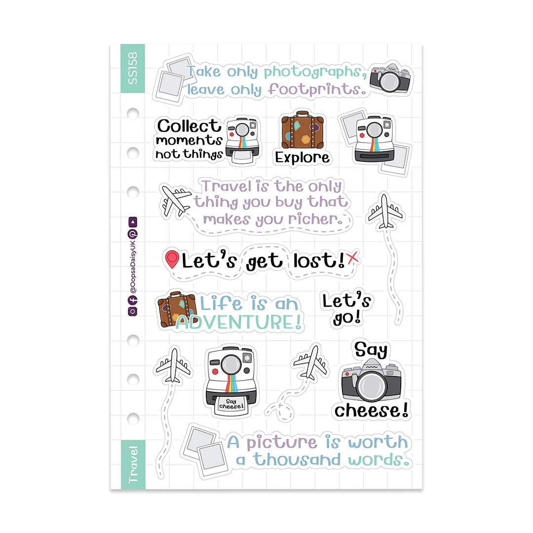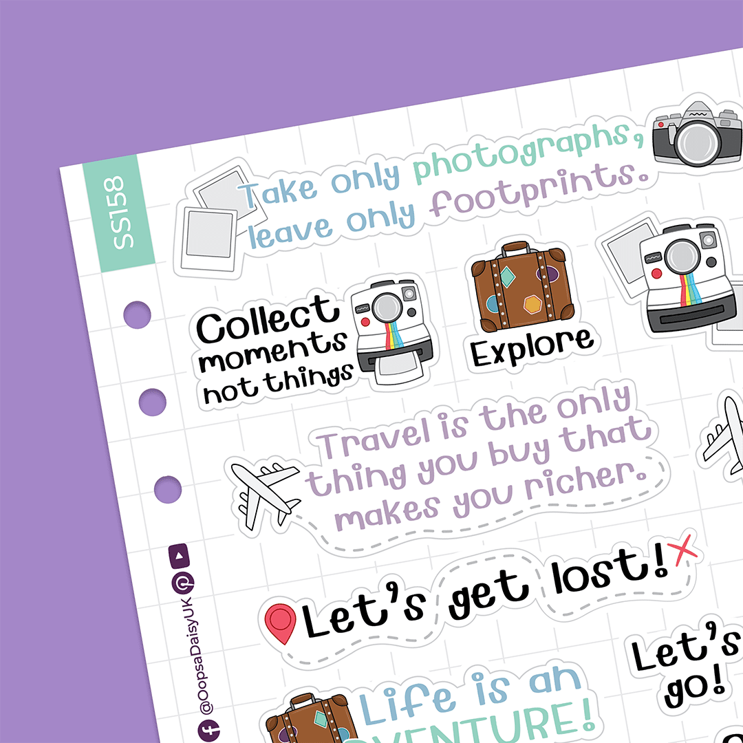 Create beautiful travel and holiday themed journal spreads with these cute quote stickers, featuring a variety of travel and photography themed-quotes with cameras, places and suitcases.